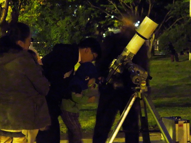 望遠鏡でのぞくと目がちかちかするほどまぶしく見えました。※正面の明るい光が月です。
