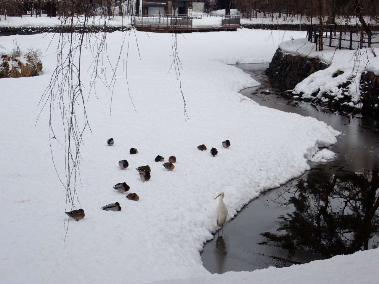 ボート池には昨日も、ダイサギが来ていました。雪が解けた場所に立つ姿がとても凛々しいですね。