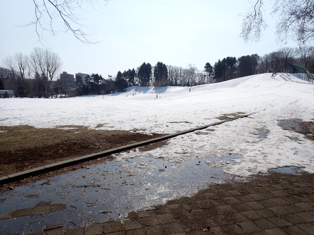 札幌の市街地の積雪は0㎝に近づいているようですが、月寒公園はまだまだ雪が残っています。