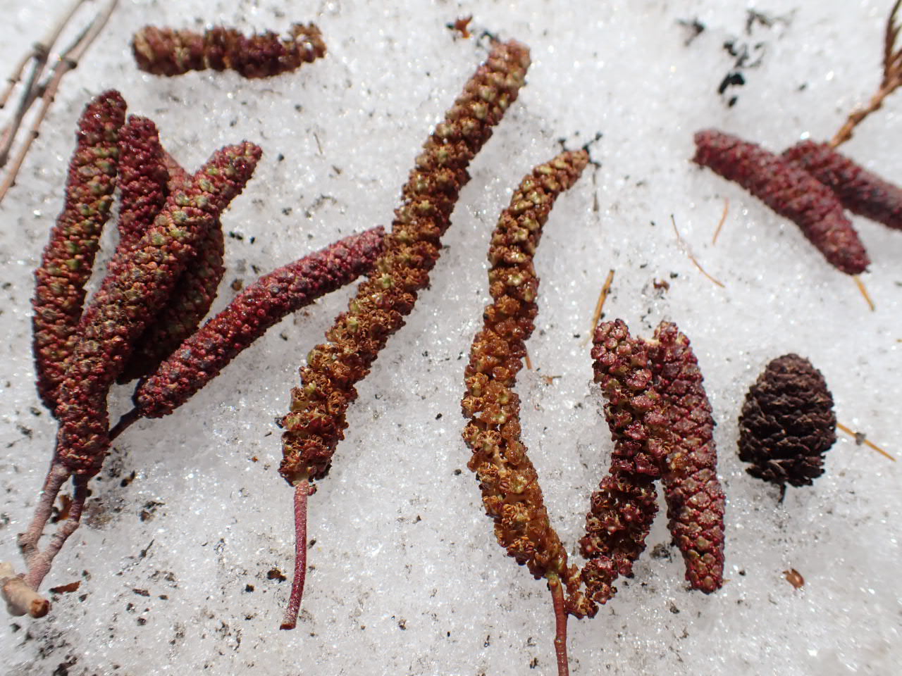 ハンノキも20メートルほどの高さになる高木なので、落ちている花を観察しました。写真の中央の長い2本が開花した雄花で、その両隣の少し短いものが開花前の雄花です。開花した雄花は長く伸びて花粉を飛ばします。