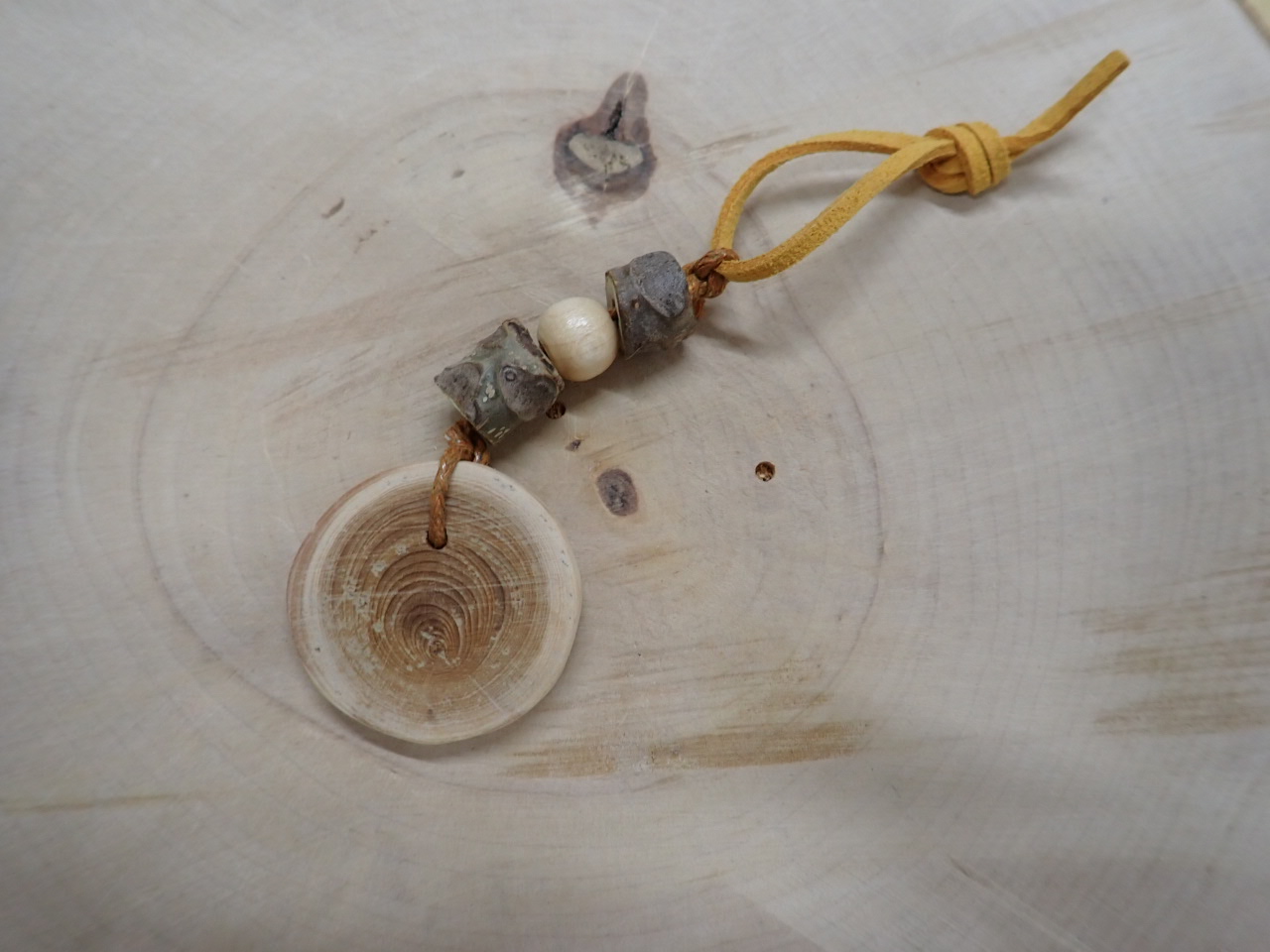 自分でピカピカにした木の小さな輪切りは愛着がわいて大事なチャームに