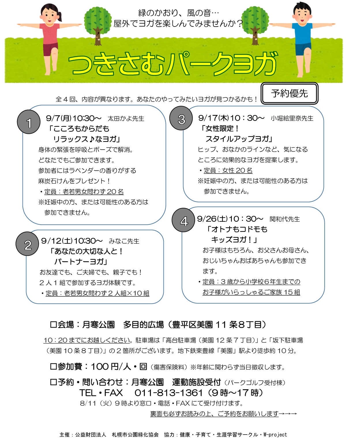 「つきさむパークヨガ」最終回は9/26(土)、「オトナもコドモもキッズヨガ!」です。