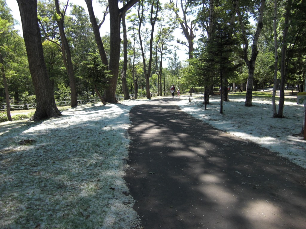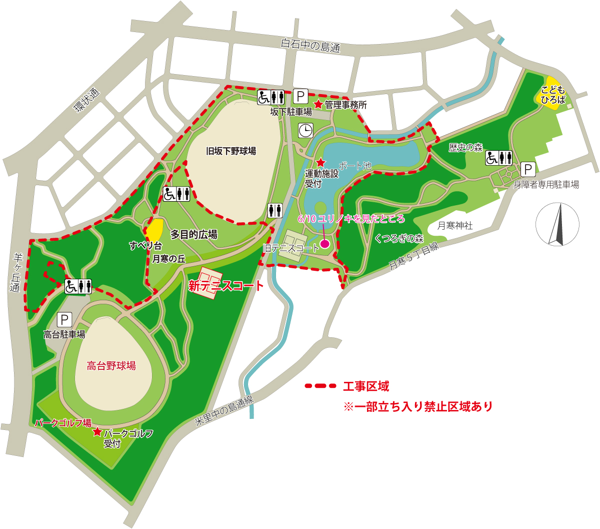 現在、月寒公園再整備工事において、8月中旬頃まで高台野球場東側から多目的広場周辺園路の塗装工事を行っております。