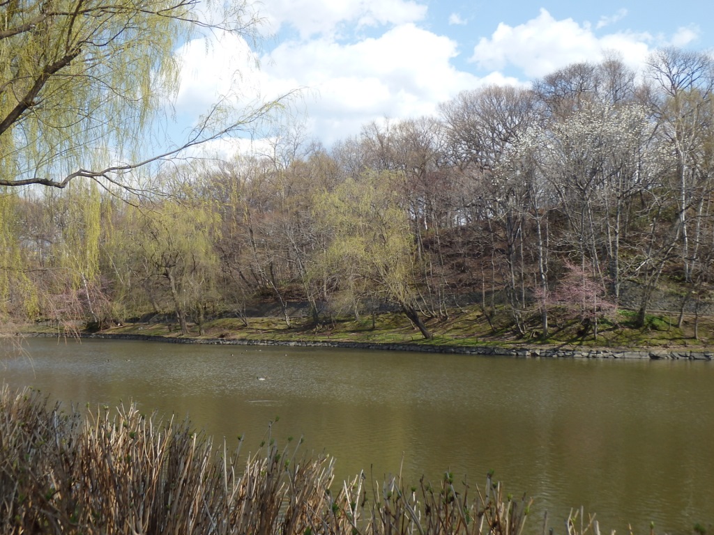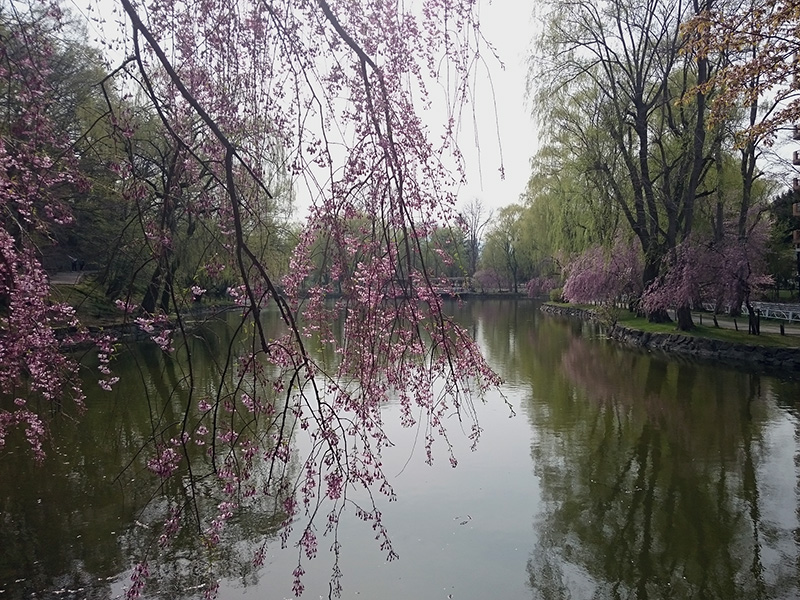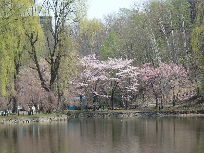 ボート池の東側のエゾヤマザクラは満開を少し過ぎ、散り始めました。