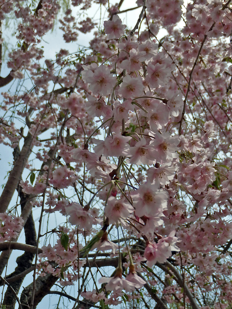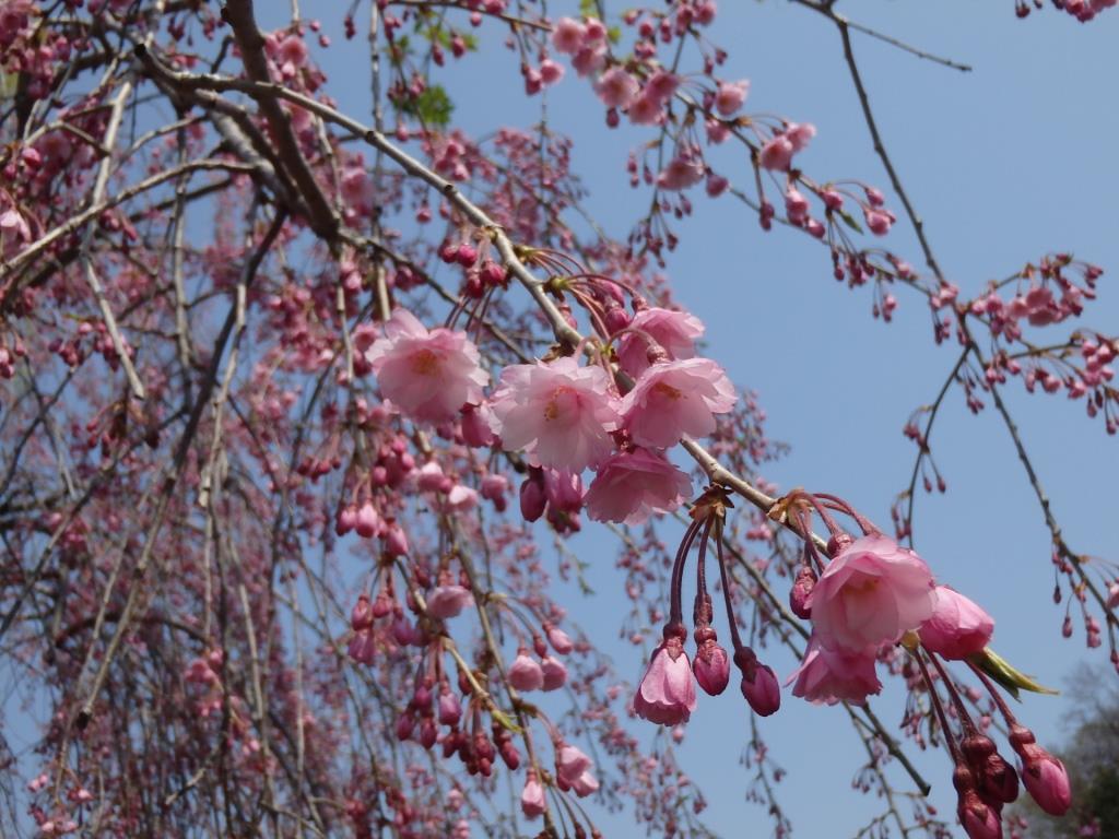 それに取って代わるように、近くのシダレザクラのピンクが濃くなってきています。