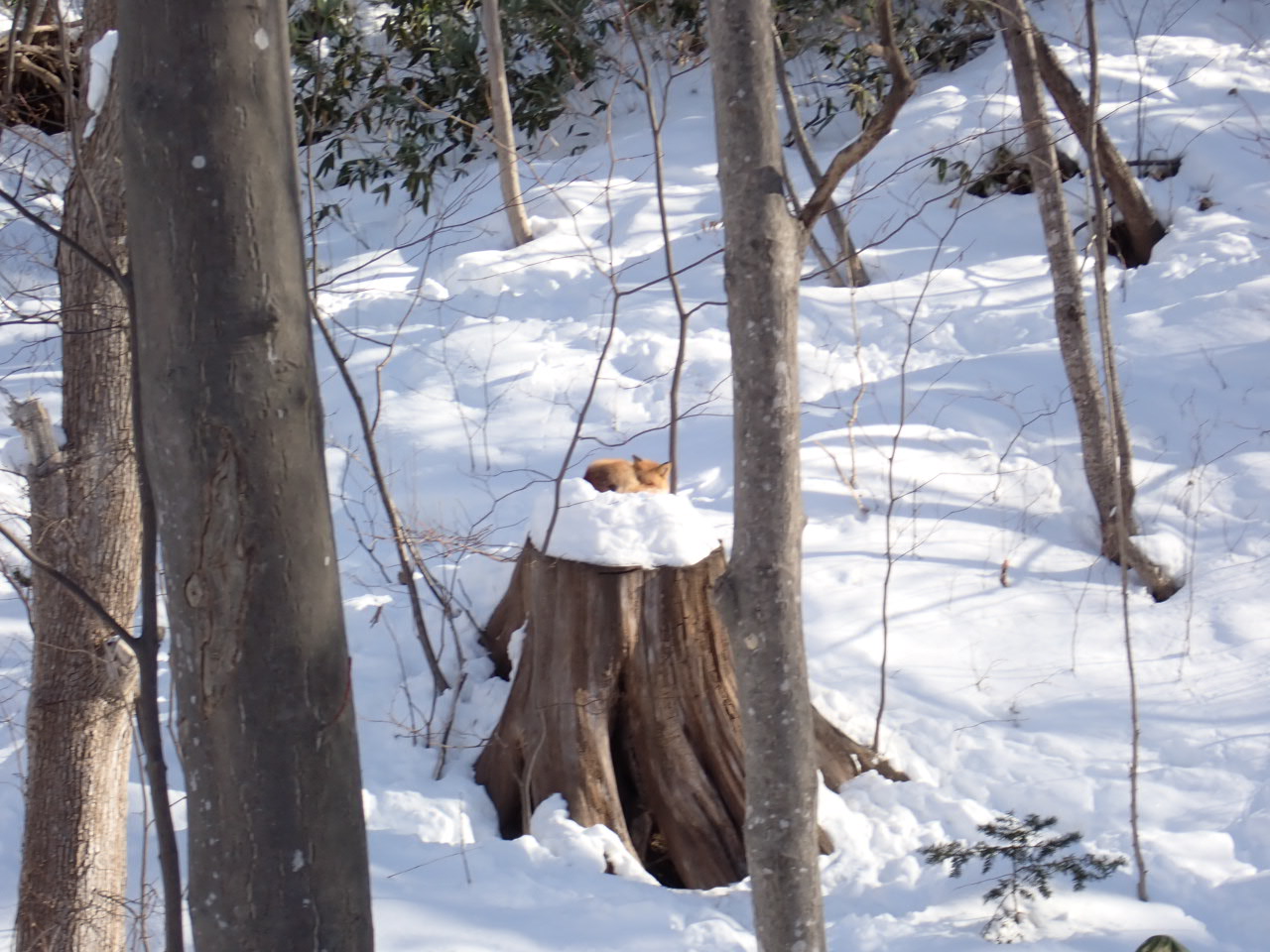 この場所は、この時期のキツネのお気に入りの場所のようで、今日も気持ちよさそうに寝ていました。初めて見る野生のキツネの姿にドキドキしたり、見つけられずにヤキモキしたり・・・・一定の距離をとって、しばしの間キツネを観察しました。