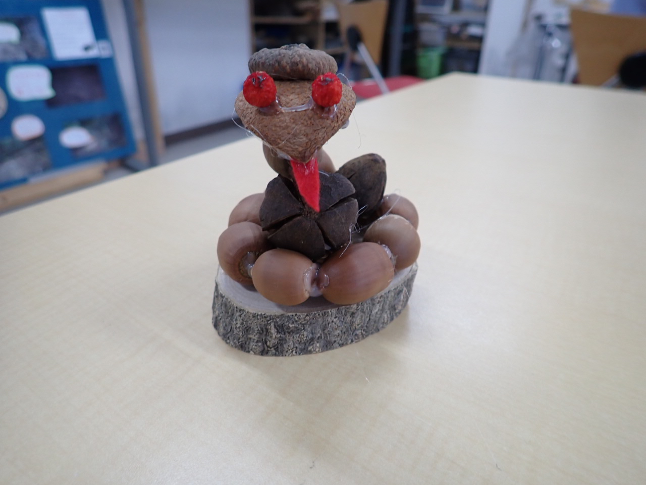 直径8センチほどの木の輪切りの台の上に木の実を使って干支のヘビを作ります。