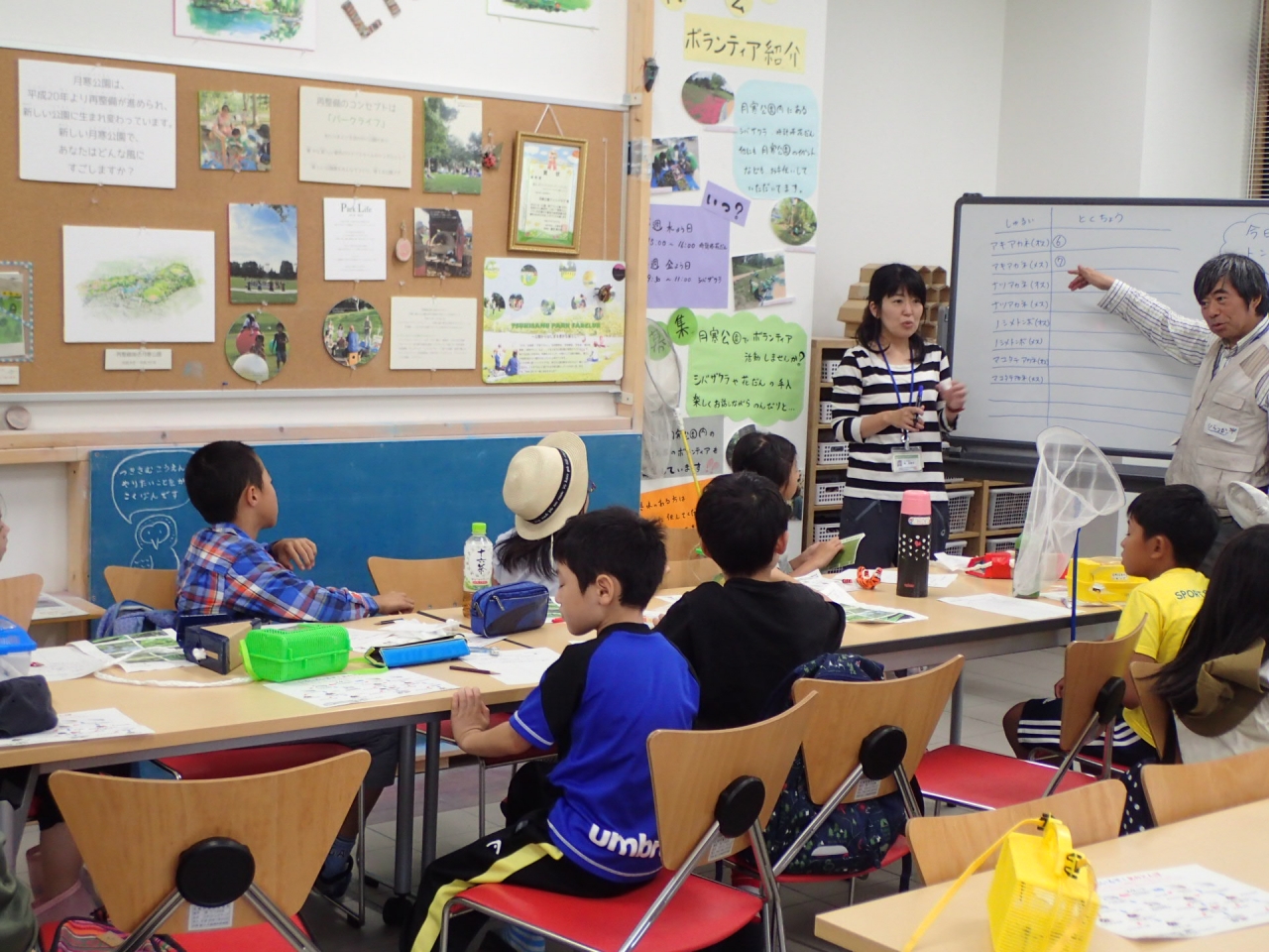 調査が終わったらパークライフセンターに戻り、自分がとったトンボが何トンボか調べた後、みんなで今日とれたトンボを確認しました。