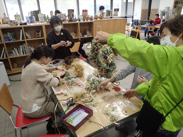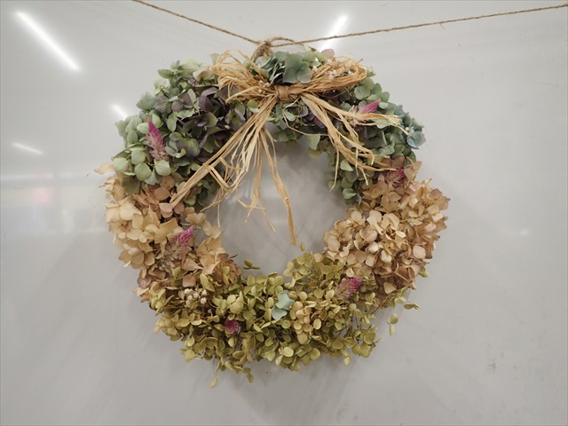 丸いリースにアジサイを繊細にあしらって、かわいいリースを作る方・・・・・・
