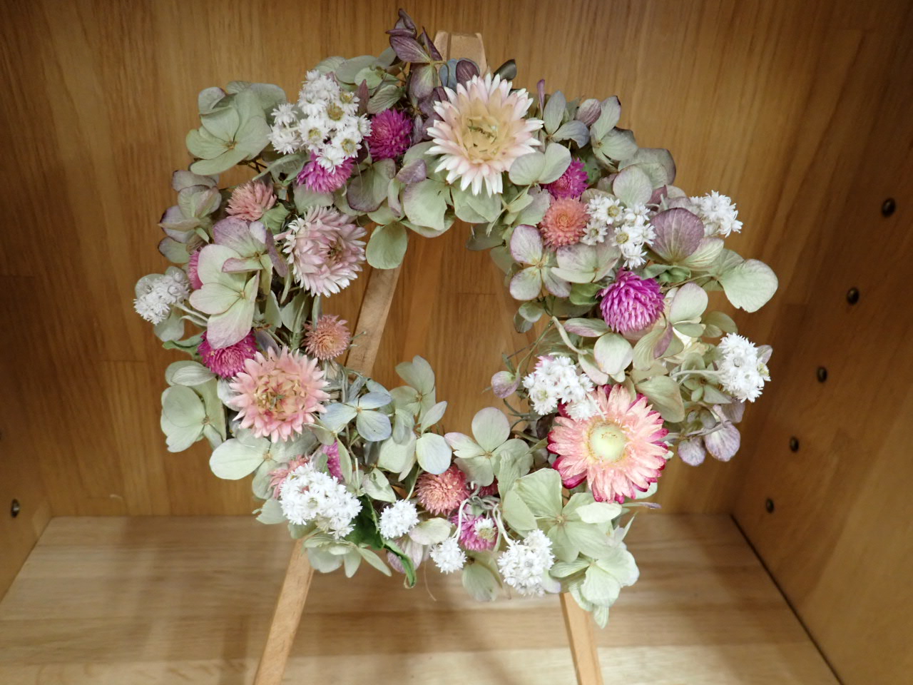 直径12センチほどのリース枠にアジサイやヘリクリサム、センニチコウの