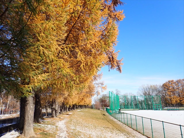 高台野球場の外周は、カラマツの並木になっているので、これから冬の始まりにかけて、