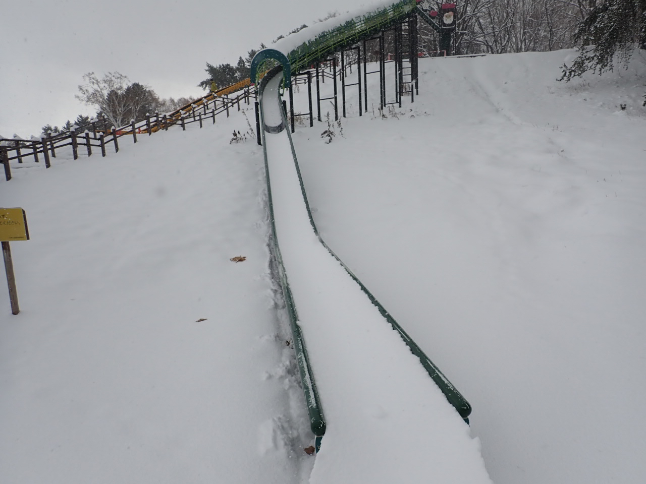ロング滑り台の上にもたくさんの雪が降り積もったので、今年度の利用は終了となり、