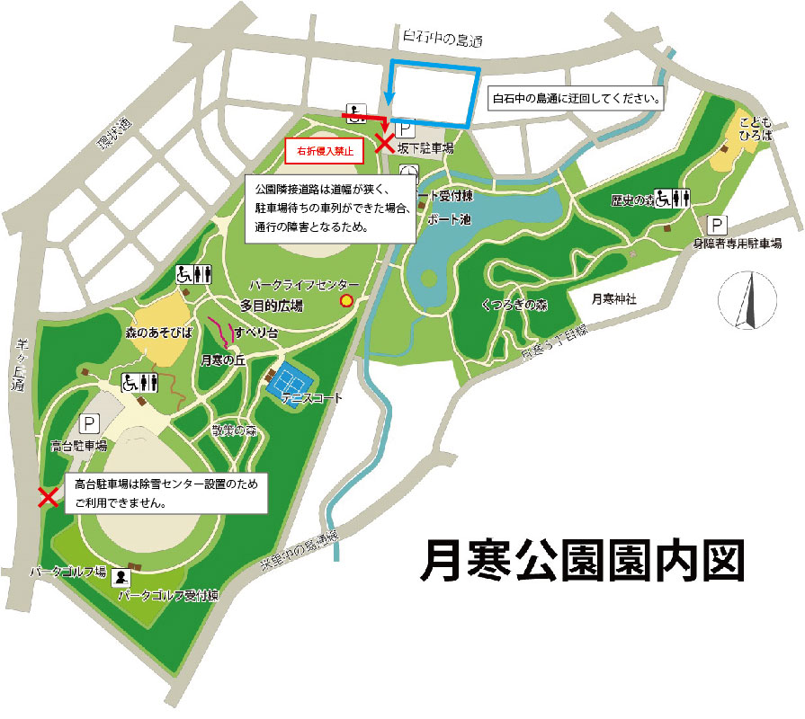 このため、休日や冬休み等の混雑時は、美園中の島線からの右折・左折による進入は、ご遠慮ください。