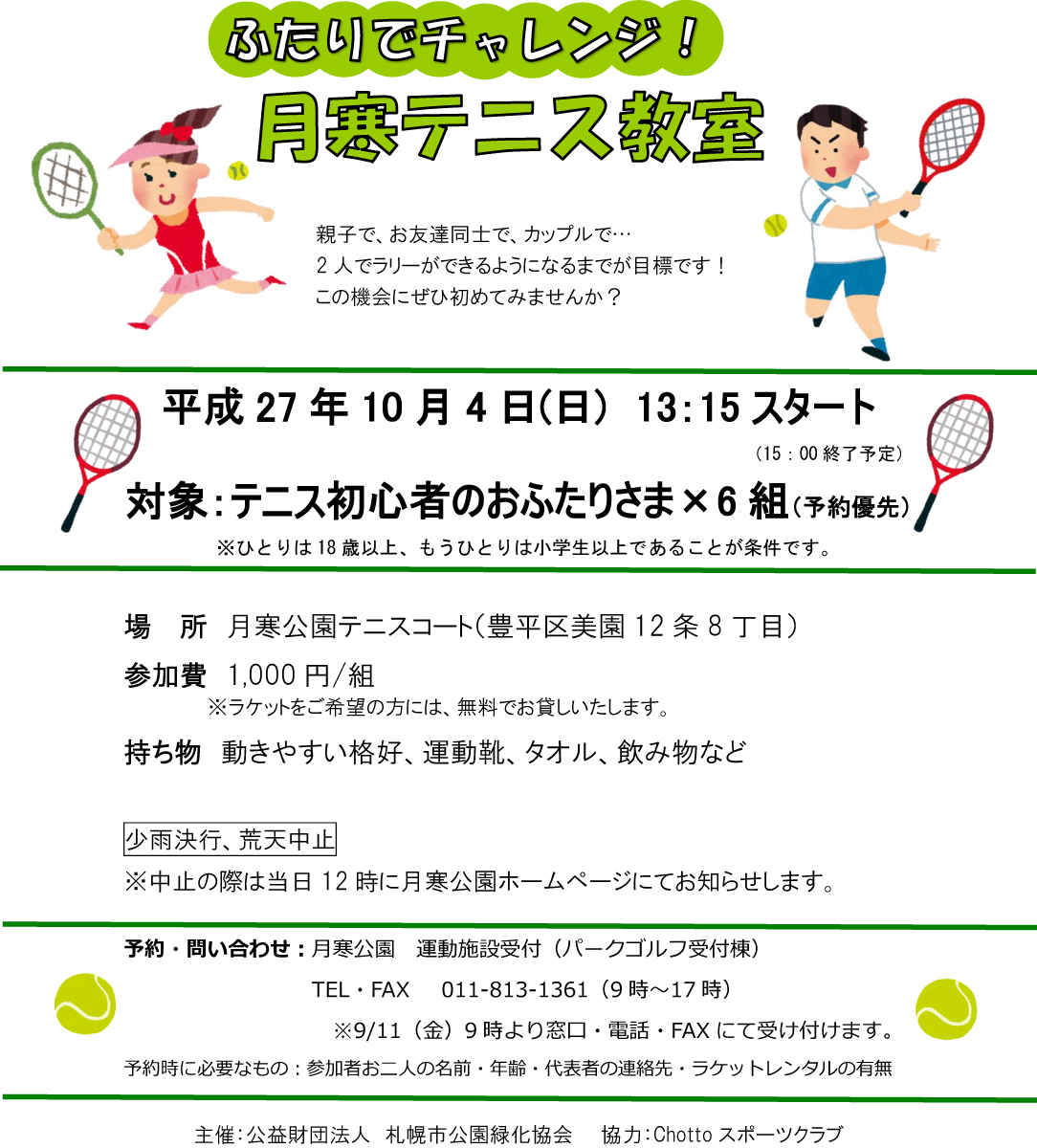 「ふたりでチャレンジ!月寒テニス教室」(9月11日9時から受付開始)