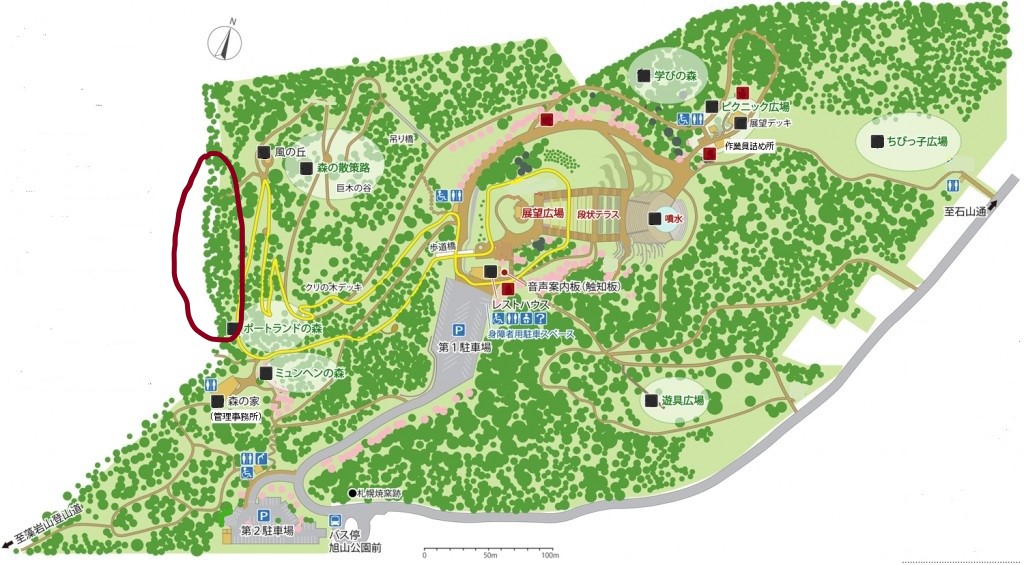 なお、カラマツ林は以下の地図のまるで囲んだ辺りです(クリックすると大きな画面で見ることができます)。