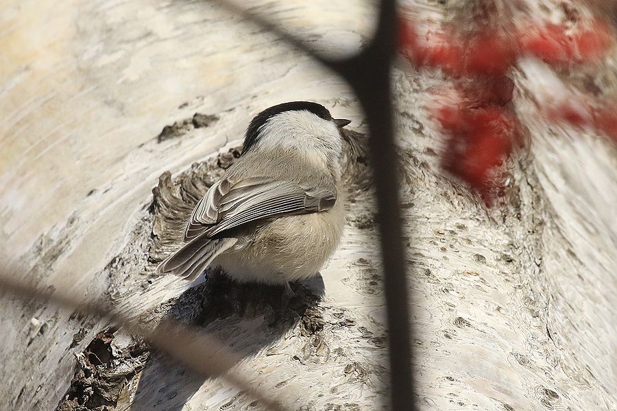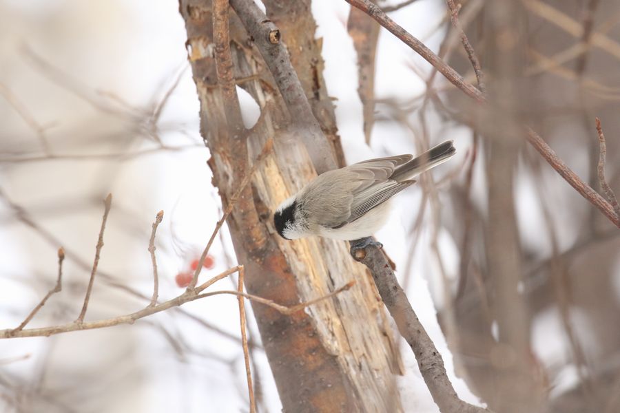 この1枚では断定できないのですが、この時撮った同じ個体の別角度の写真を何枚か見たところ、ハシブトガラではなくコガラと思われる個体でした。この写真でいえば、翼の次列風切り羽(背中に近い側の羽)の白い帯状の羽がやや目立つのがコガラの特徴といえる部分ですが、しかしこれだけでは不十分で、ハシブトガラでもそこが白っぽく見えることがあります。