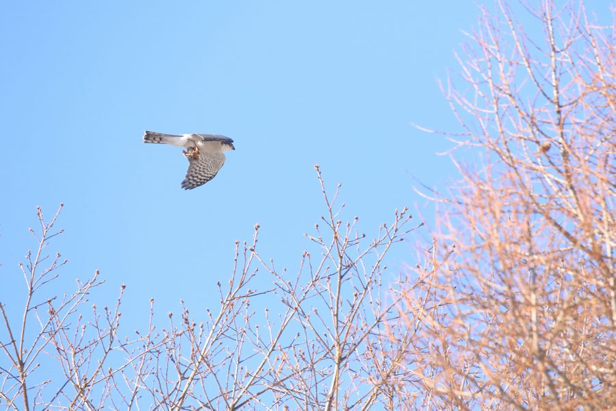 写真は今朝撮影したものですが、この時はすでに足に何かをつかんでいるのが写真を拡大すると分かり、この時はカラマツ林の方に飛んで行きました。