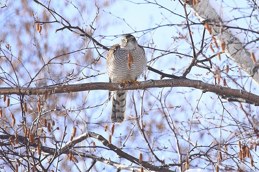 次の写真は1月2日に撮影したもので、西側の山から飛んで来て森の家の裏のシラカンバにとまって辺りの様子をうかがっていました。