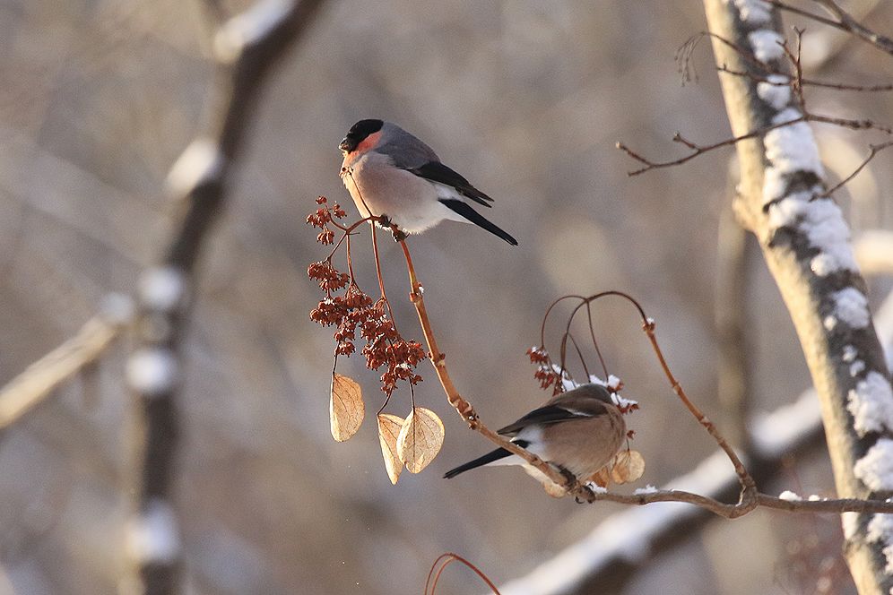 1羽がお腹がかなり茶色い亜種アカウソで、他にアカウソは2羽ほどいて、灰色のウソもいますが、計8羽前後で動いているようで、両方を一緒に見ることもあります。