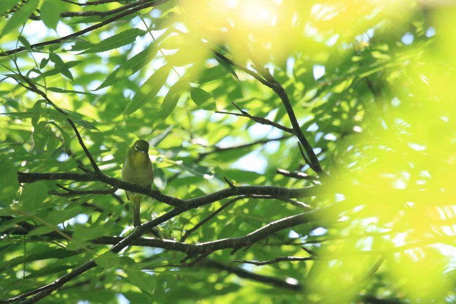 姿は広葉樹の中にいて見つけにくいですが、写真のように葉が切れた枝などに来て観察・撮影できることがあります。