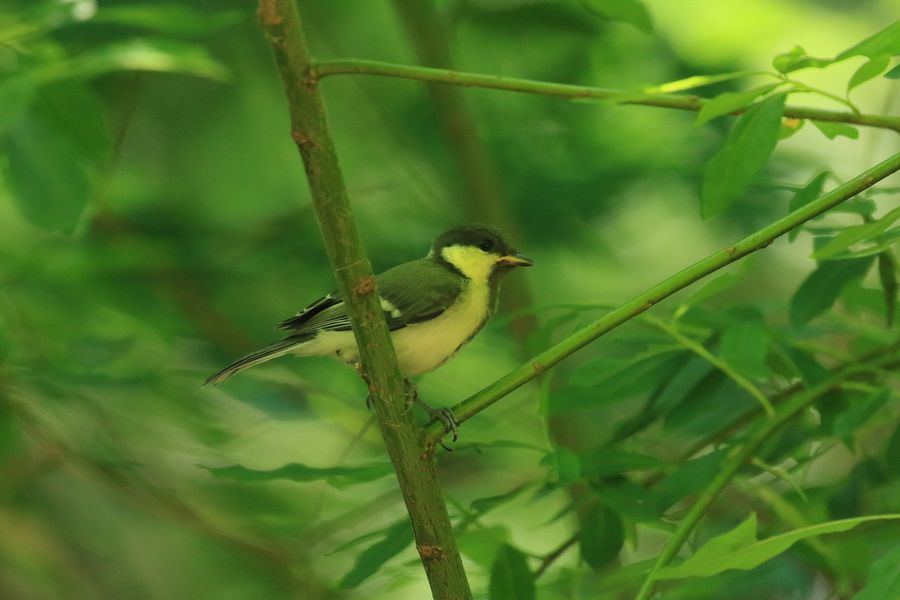 シジュウカラの幼鳥は巣立ち直後はもっと白い部分の黄色みが強いので、これは巣立ちから1週間かそれ以上経っている個体で、家族と思われる数羽で行動していました。