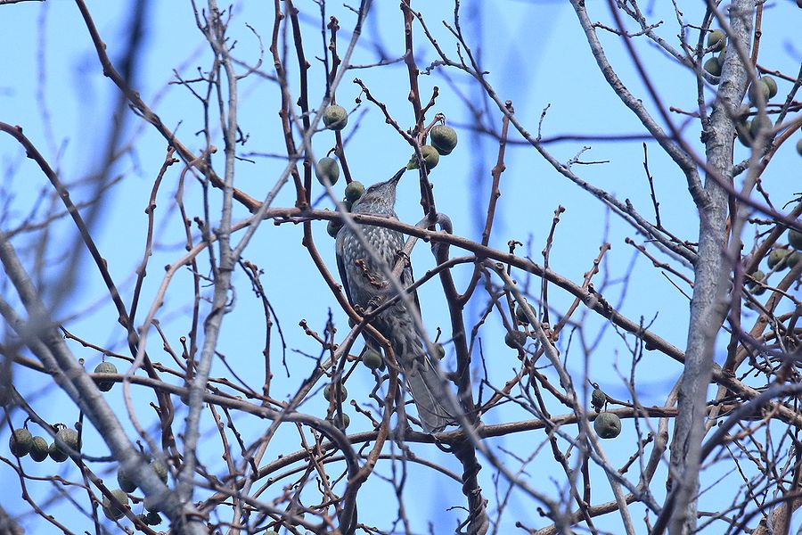数羽が園内で見られていますが、下の写真、本日、サルナシ(コクワ)の実を食べている姿が見られました。