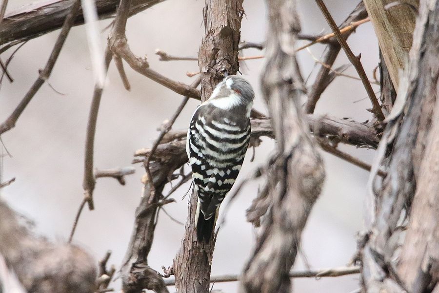 下の写真上は雄の個体で、後頭部に赤い羽が見えるのが分かります。