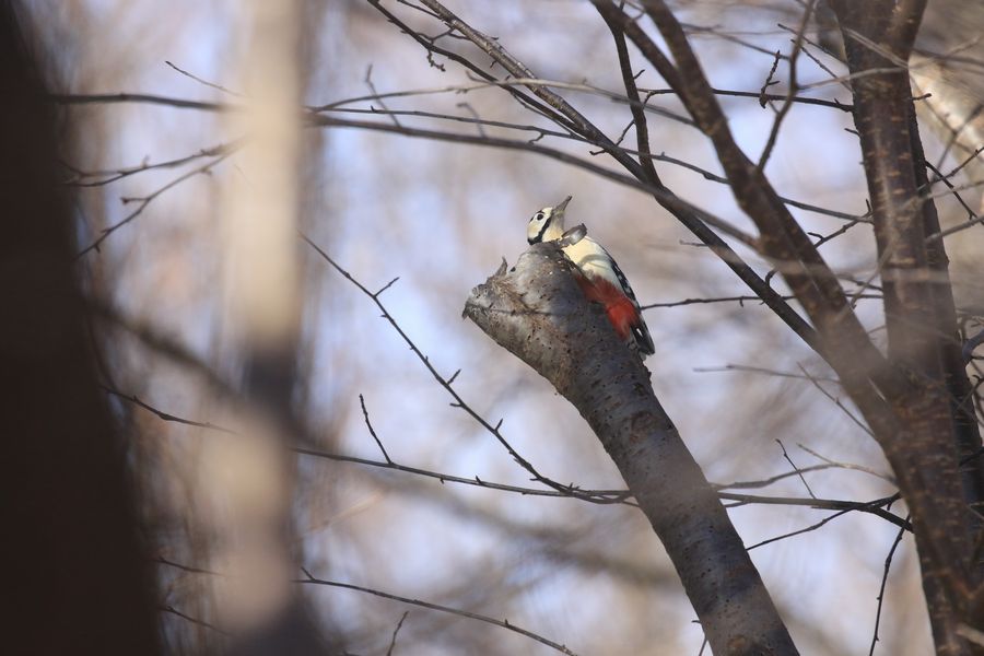 しかし、アカゲラはなぜか今の時期あまり鳴き声を出さずに餌を探していることが多いため、声では気づきにくく、近くにいても通り過ぎてしまうこともあると思われます。