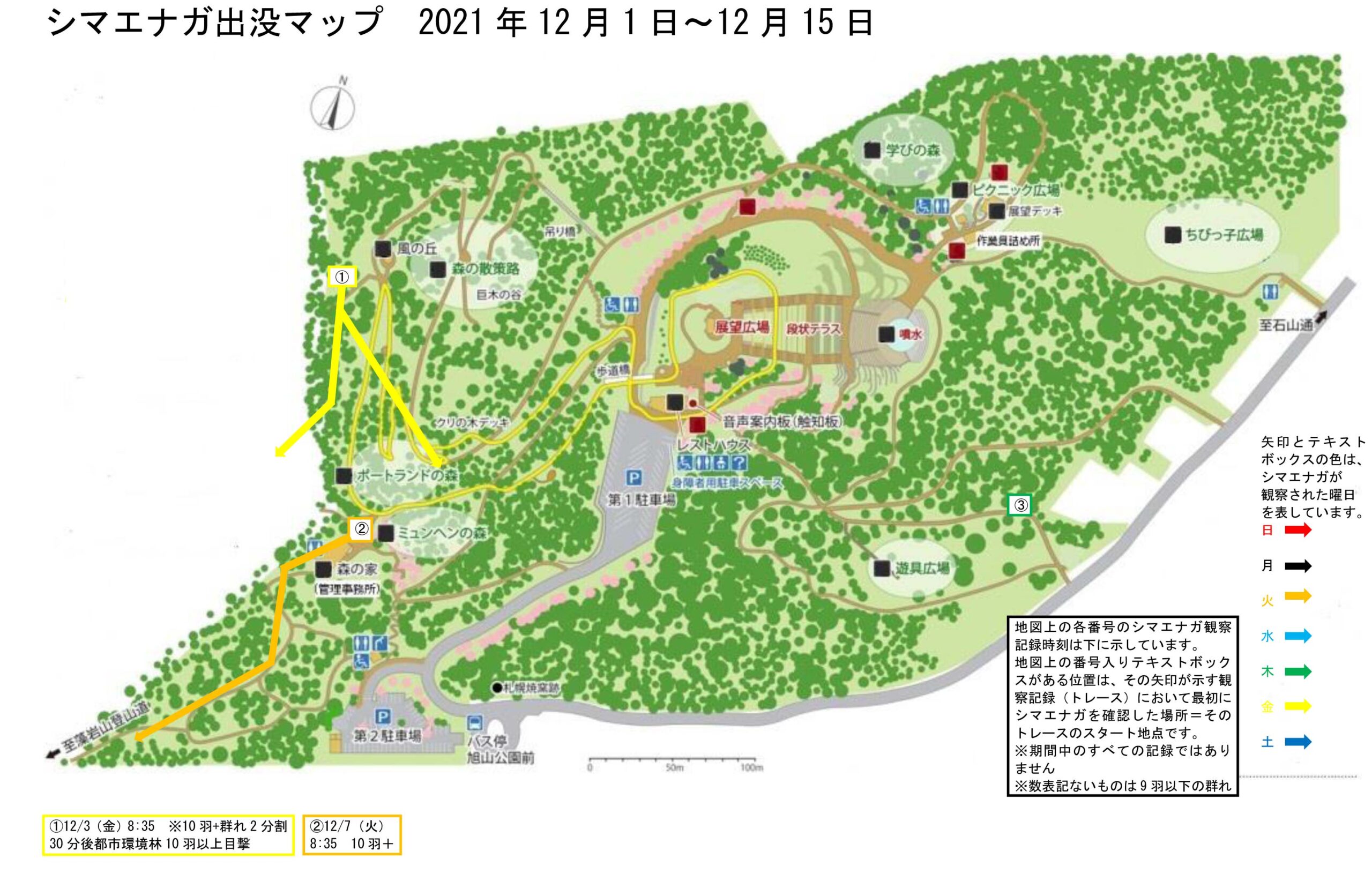 森の家では、シマエナガ観察情報を半月ごとにまとめた「シマエナガ出没マップ」を作成し、掲示板に掲出しています。