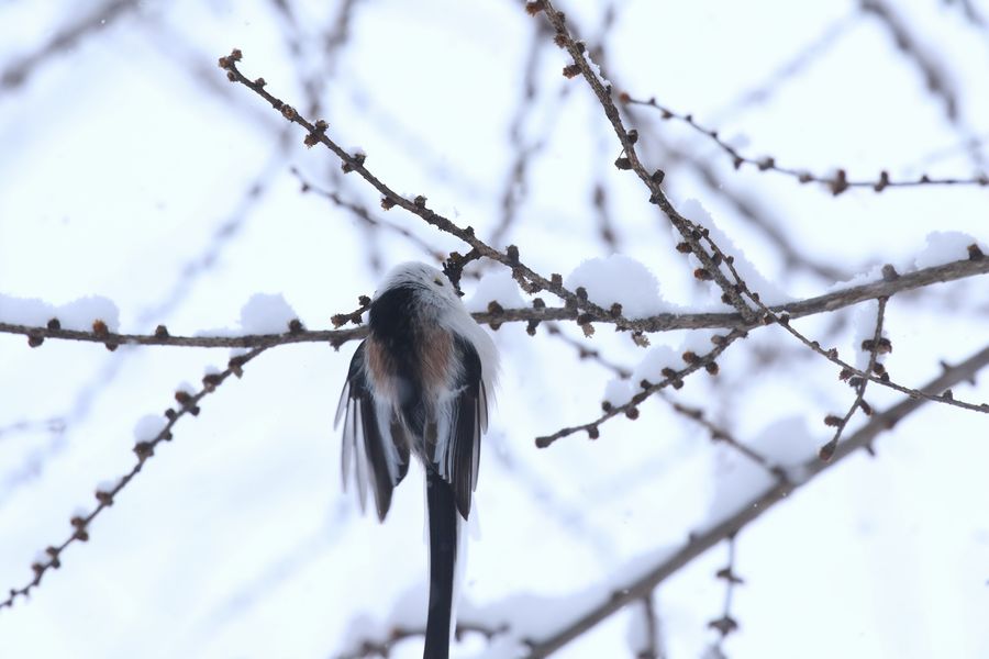 なお、動画内で「ピィピィピィ」と聞こえる大きな鳴き声はハシブトガラの囀りで、シマエナガは小さく「チー」「チャッ」などと鳴いています。