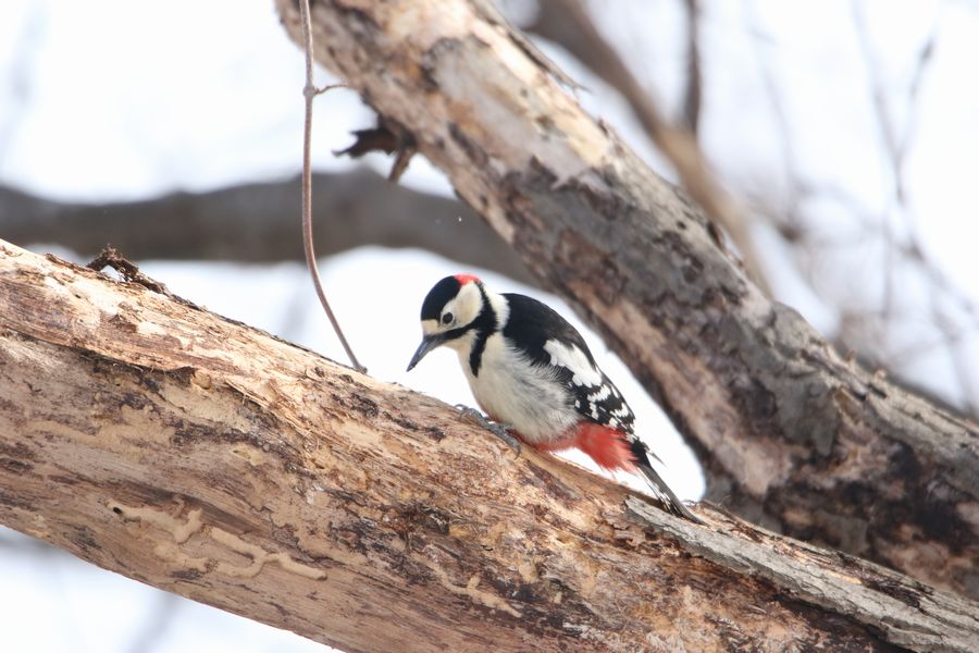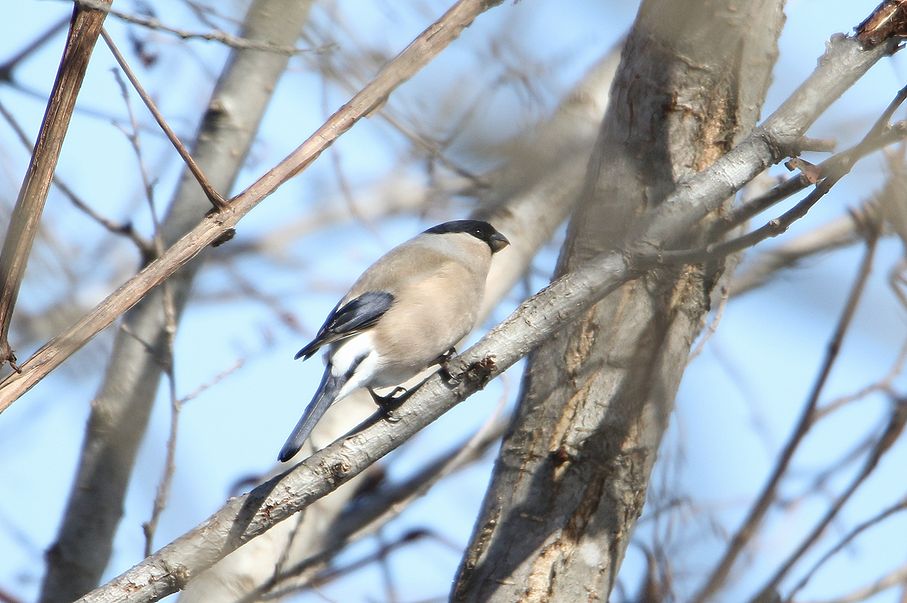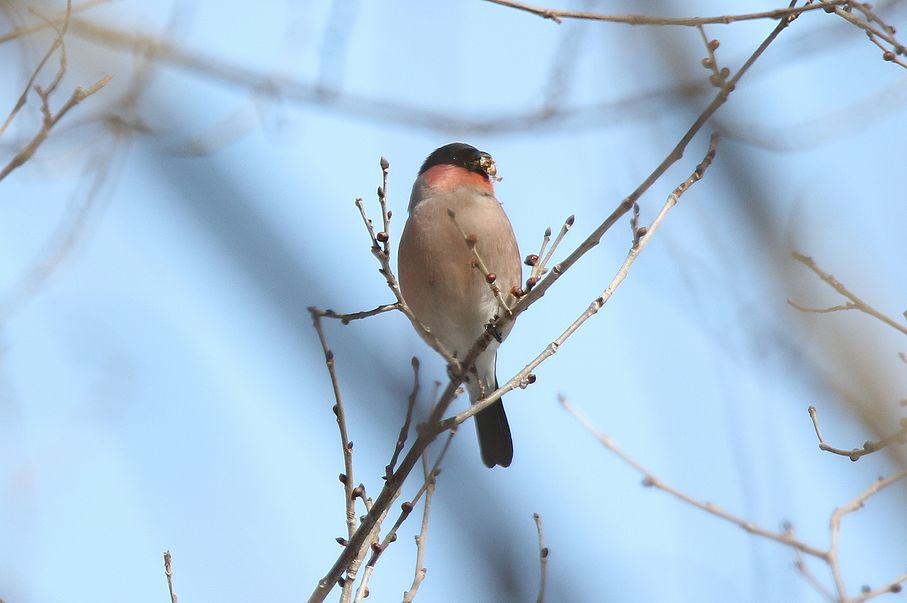 ウソ9時半過ぎから栗の木デッキ横の桜の木に雄2羽雌1羽、それほど道から離れていない木のあまり高くない枝で採餌していてじっくりと観察できました。