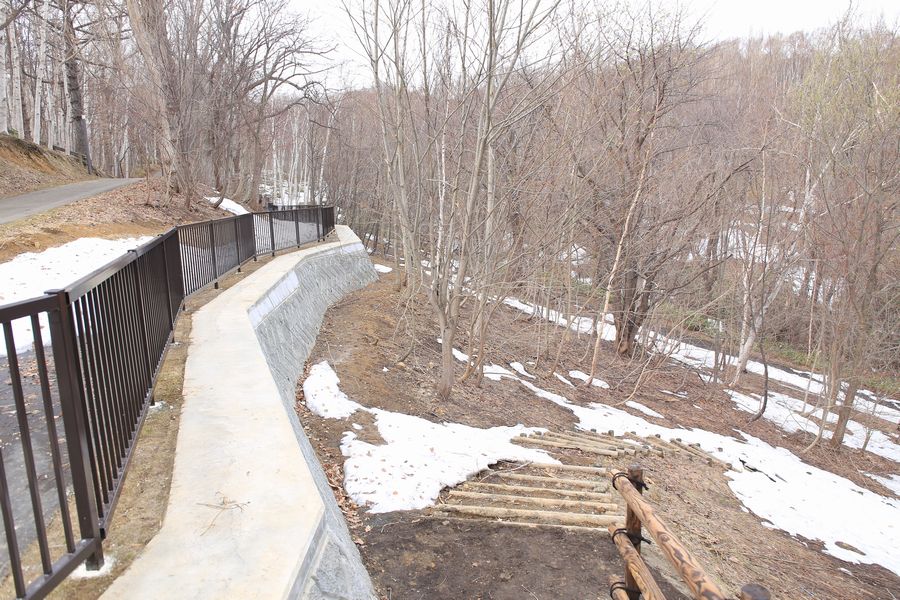 旭山記念公園、展望台とその周辺の散策はもう夏靴で大丈夫ですが、西や北を向いた斜面にはまだ雪があり、一部園路に雪が残っている場所もあります。