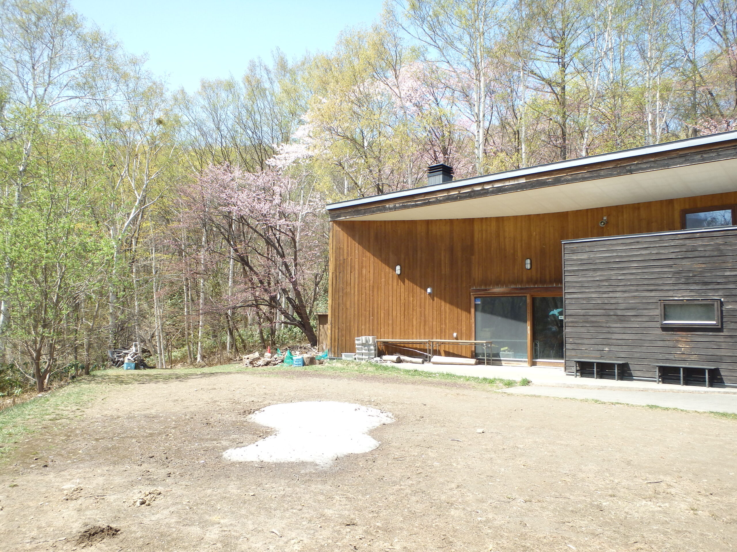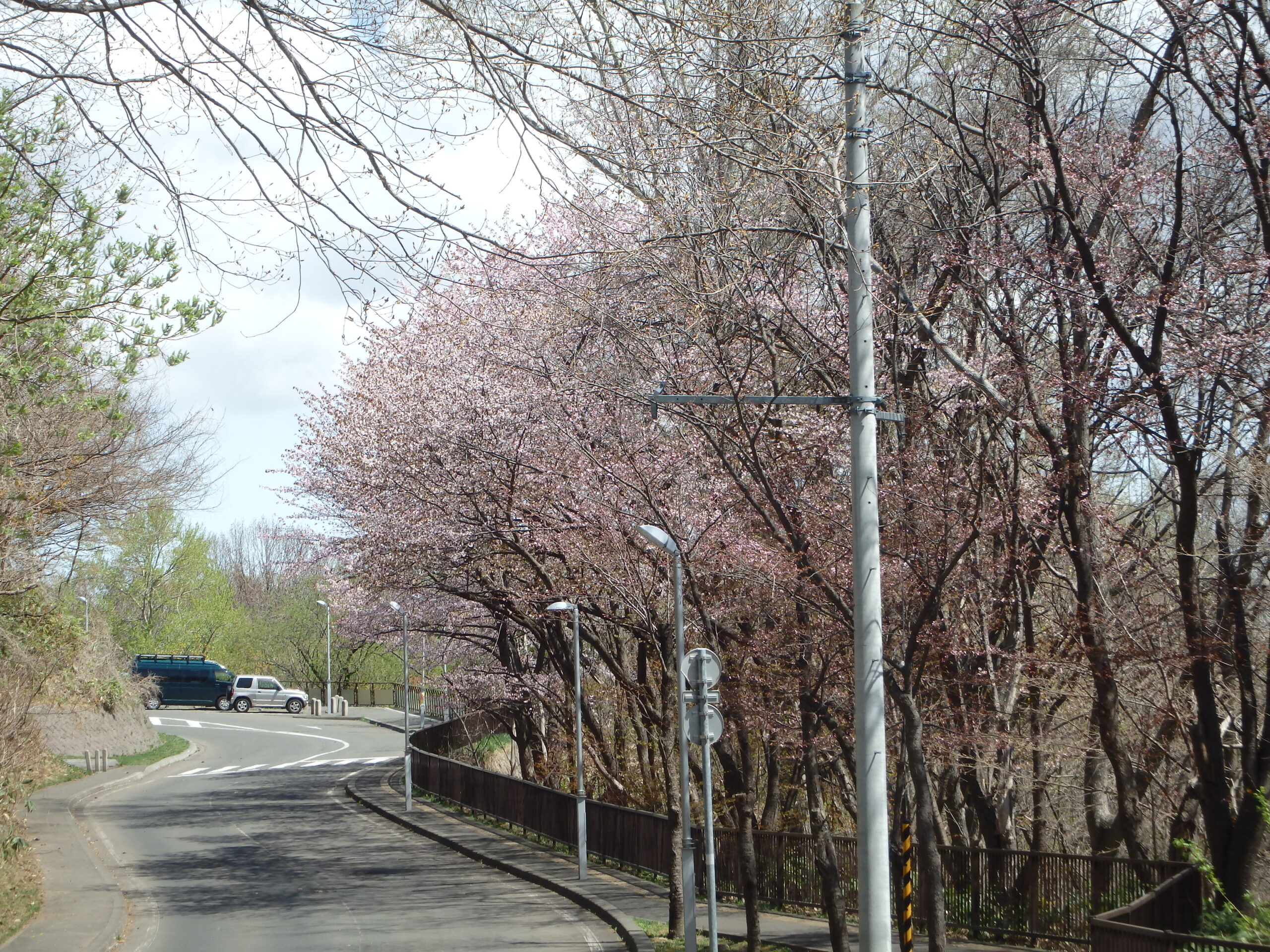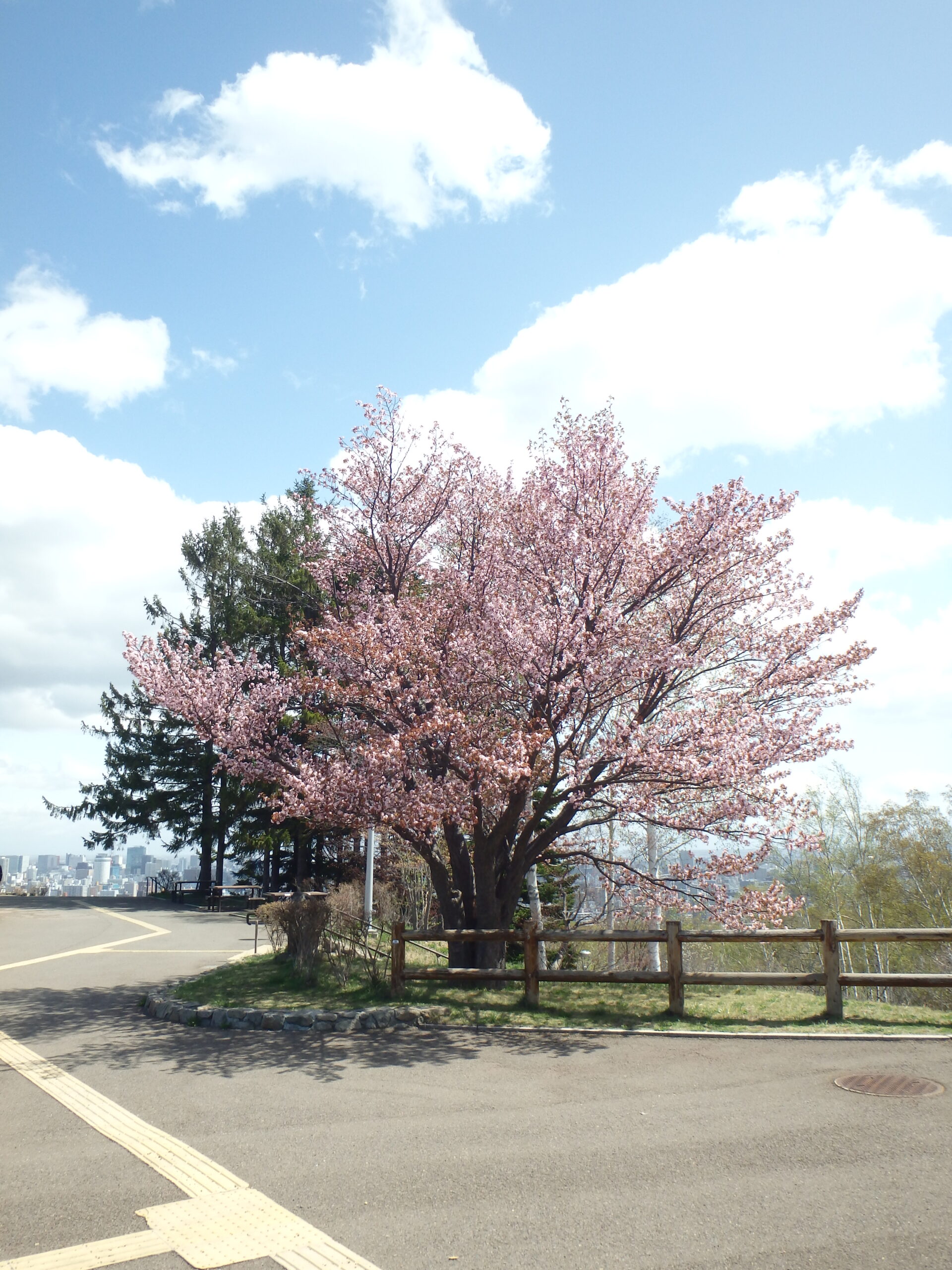 森の家の前のベンチに座って、藻岩山と桜をみていると癒されますね。