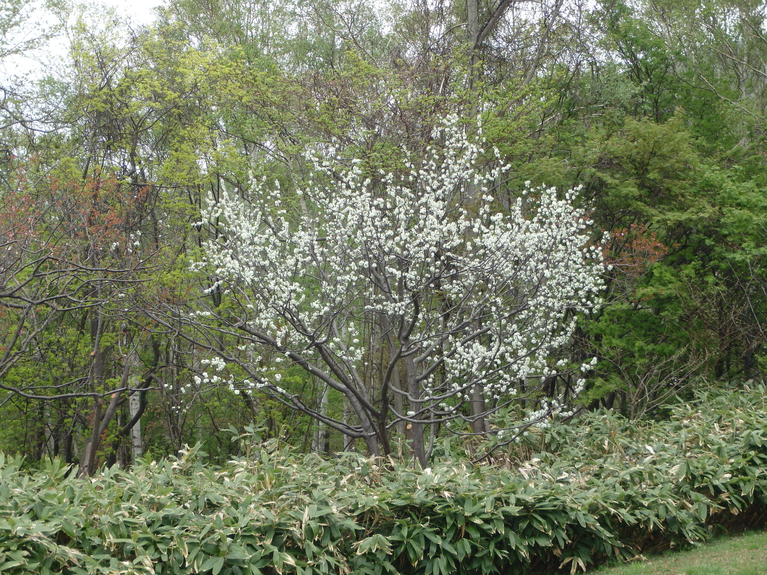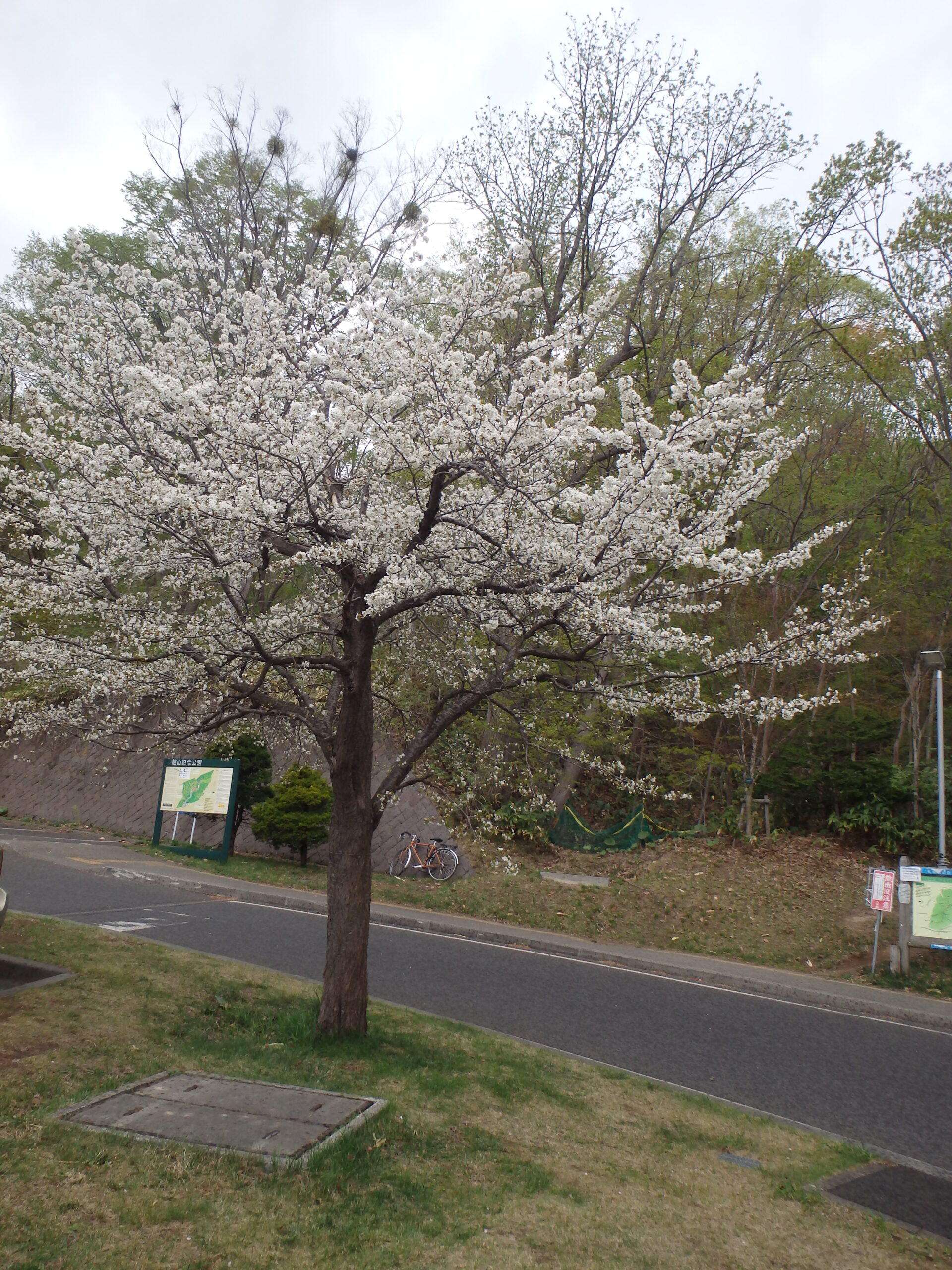 今、旭山記念公園では、白い色のカスミザクラとピンク色の八重桜が見られます。