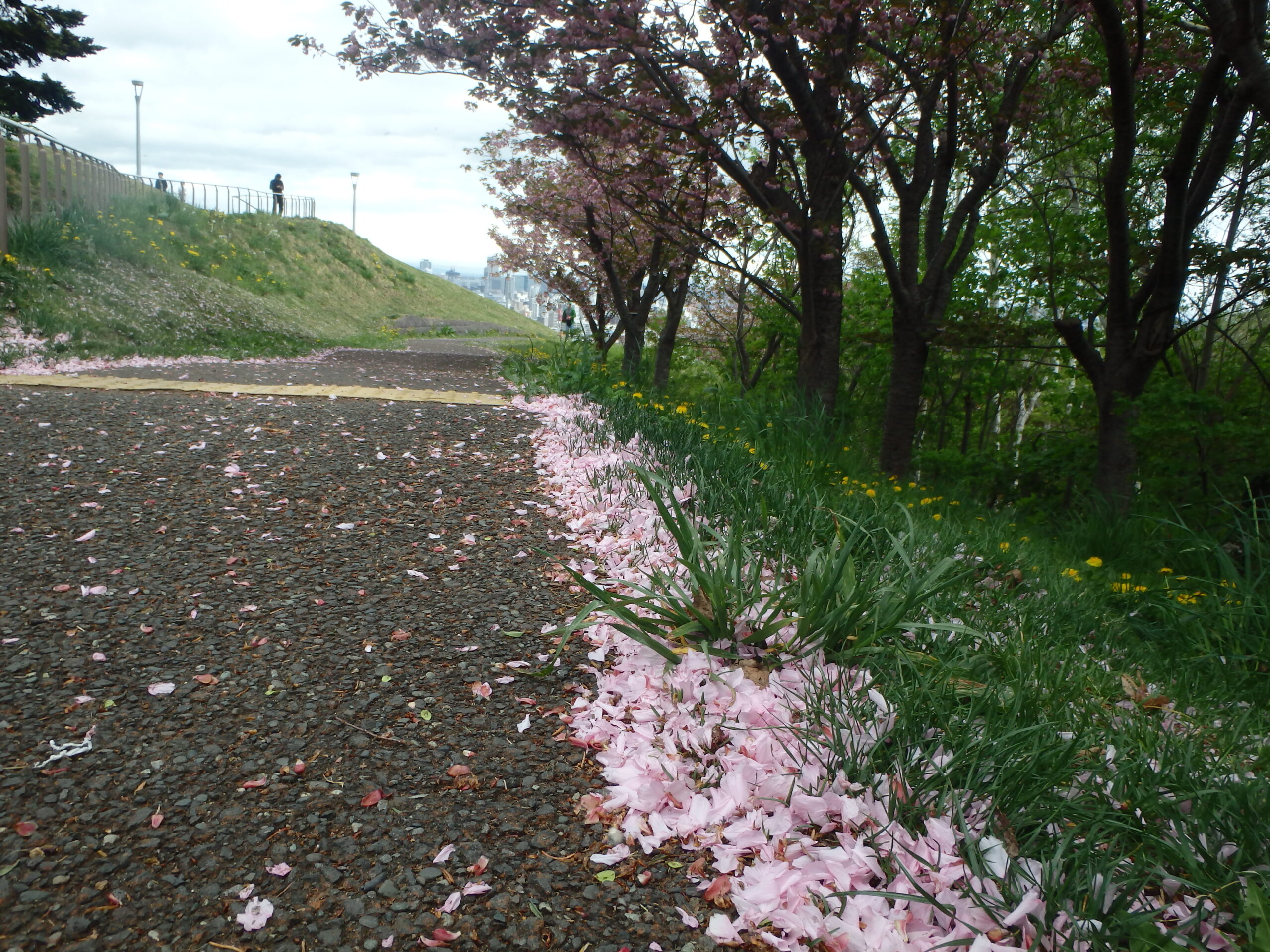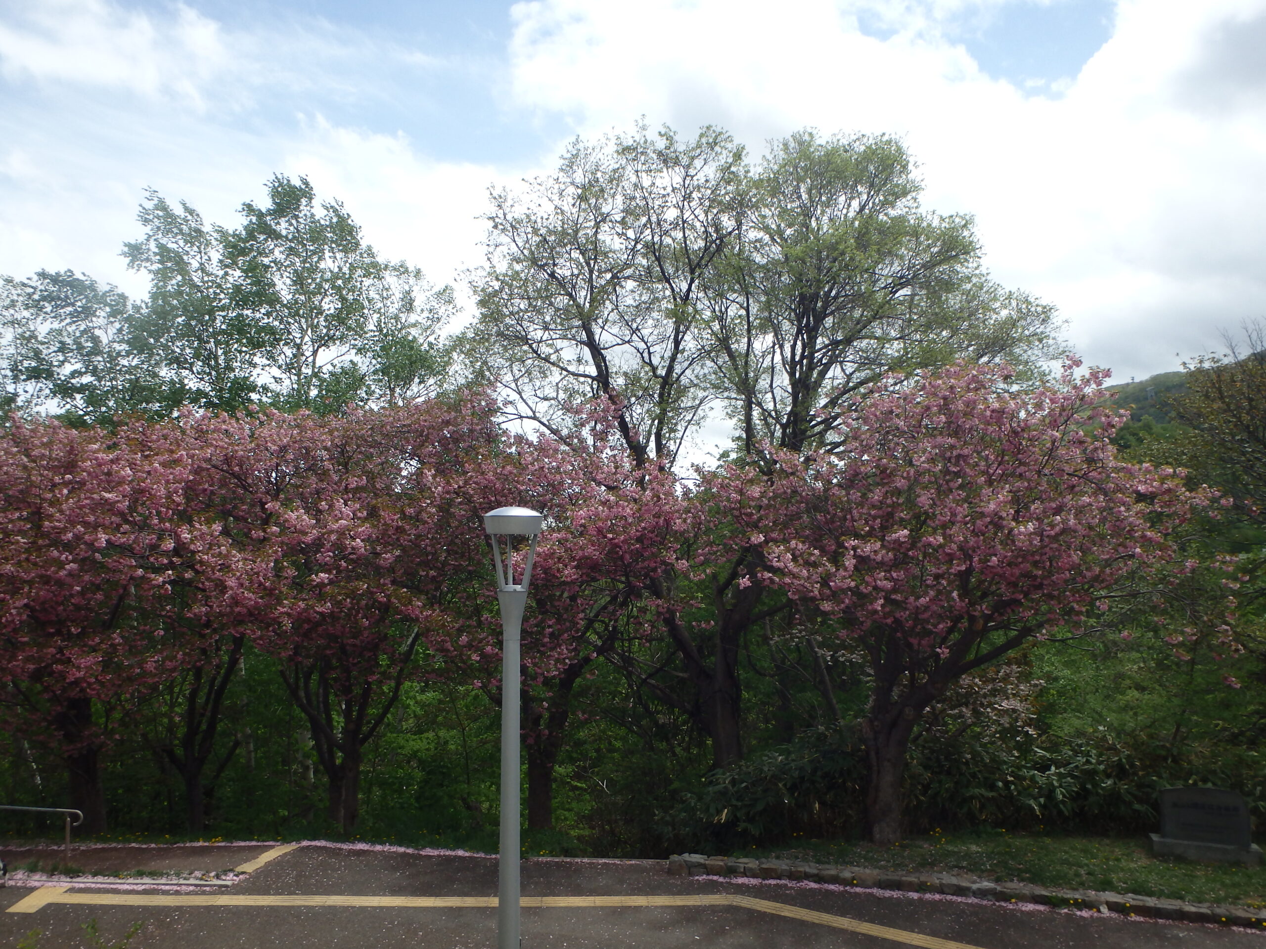 旭山記念公園の八重桜は、花びらが少し散り始めていますが、見頃を迎えてます。