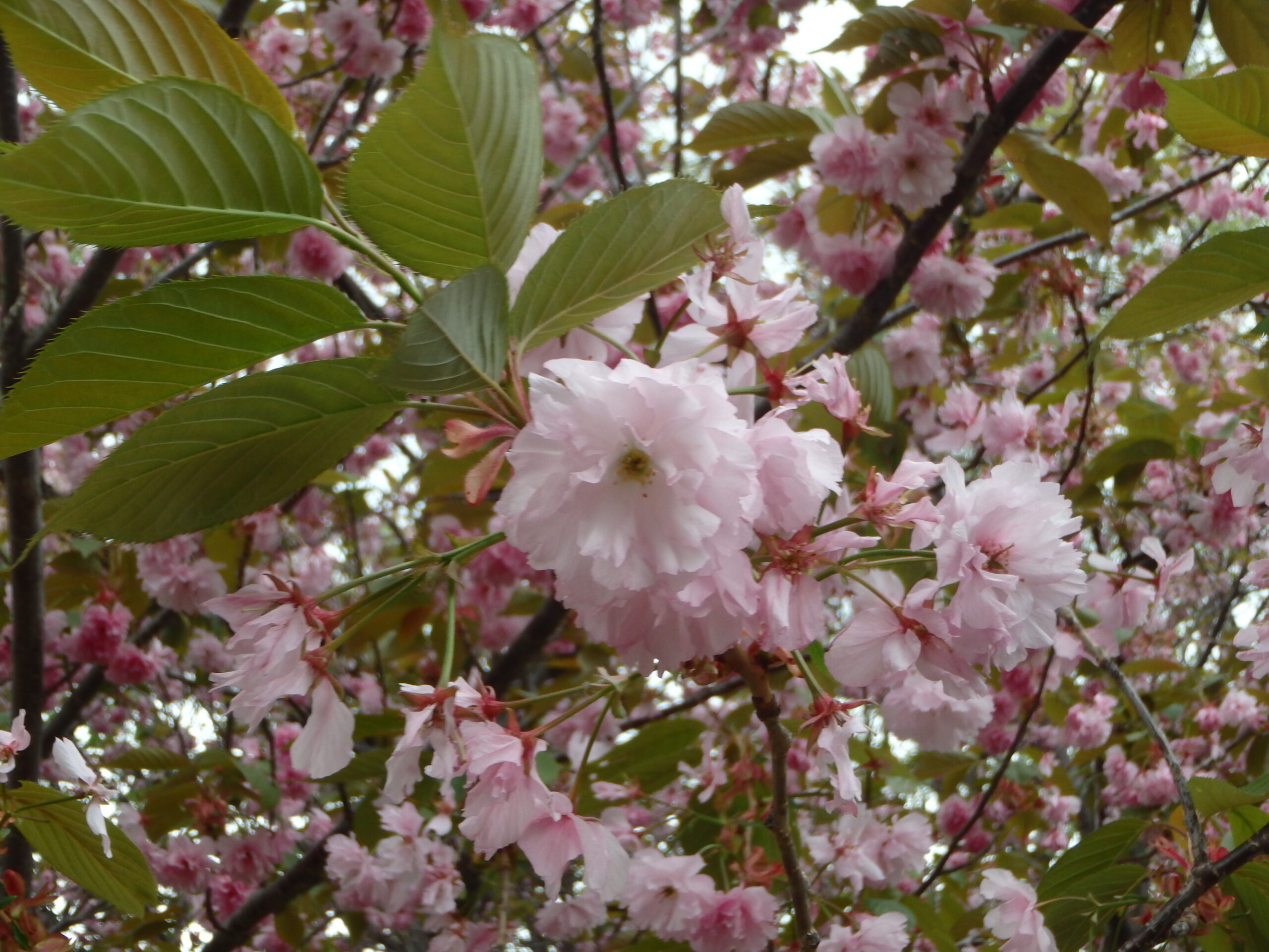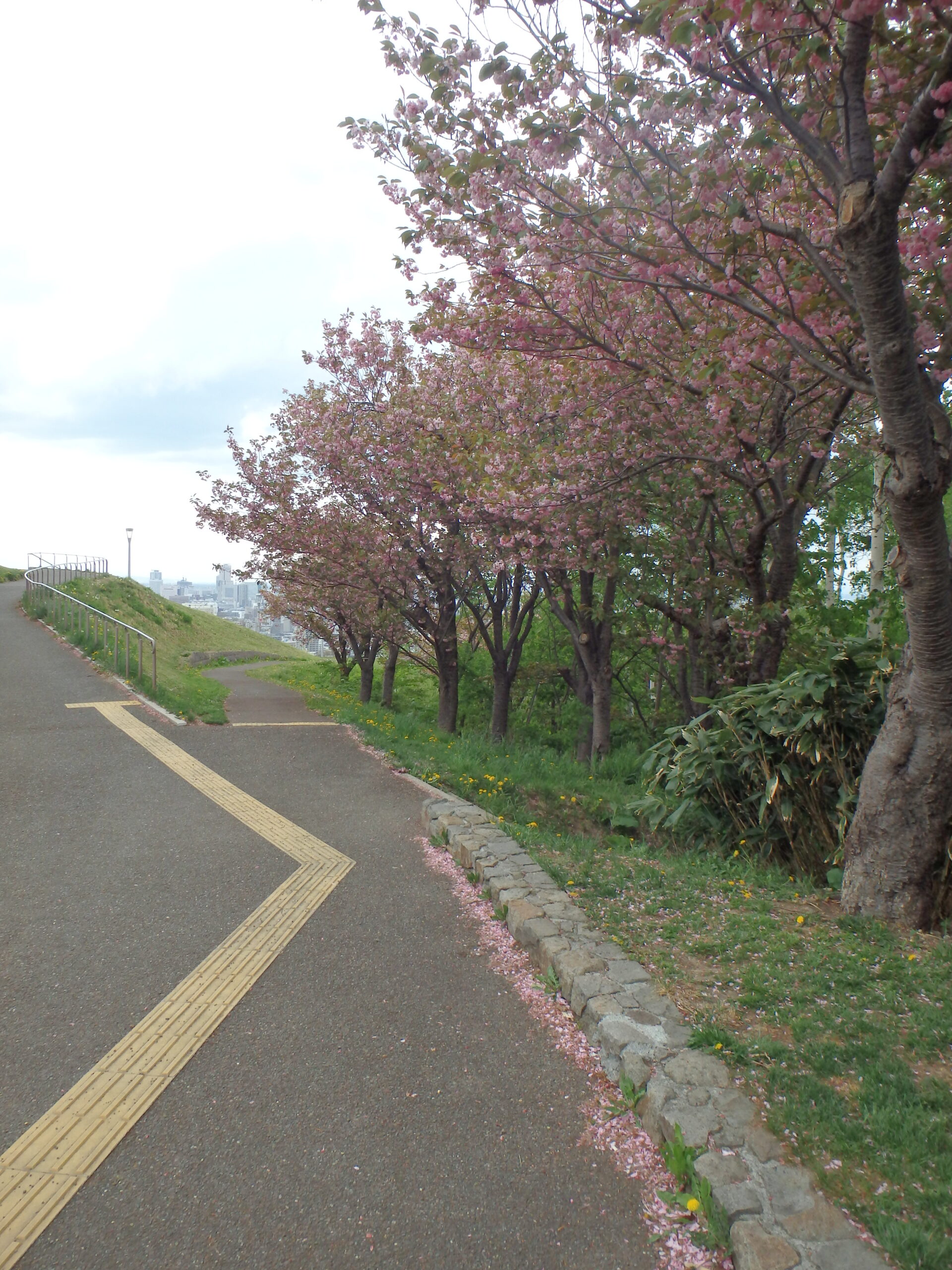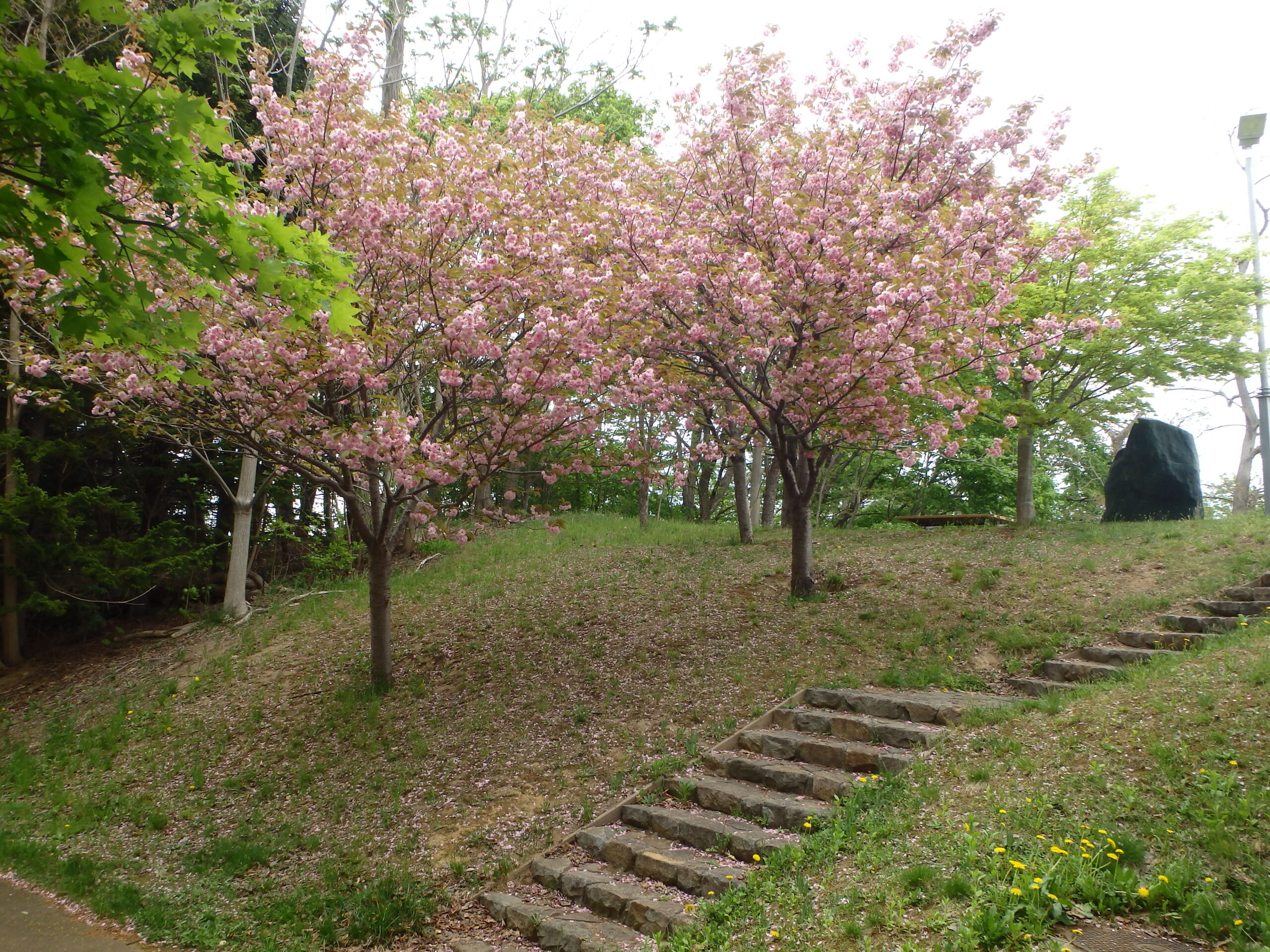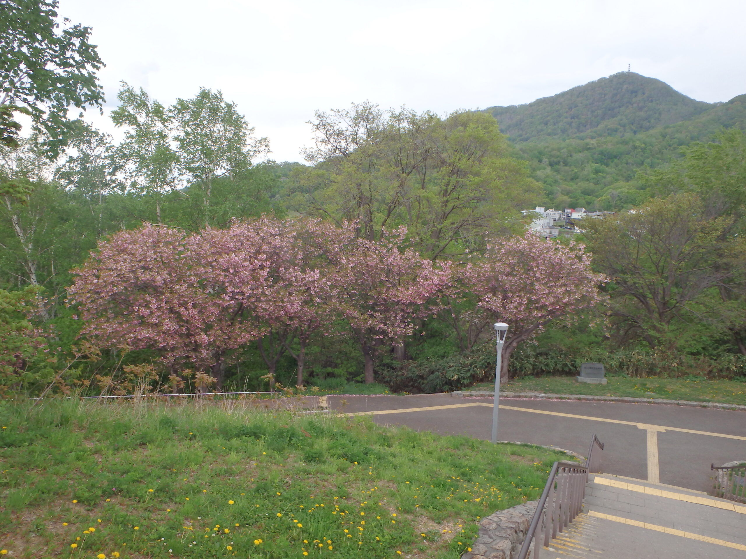 旭山記念公園の八重桜は、レストハウス横の八重桜は、少し葉が目立つようになってきていますが、新桜並木道後ろの八重桜は、綺麗に咲き誇っています。
