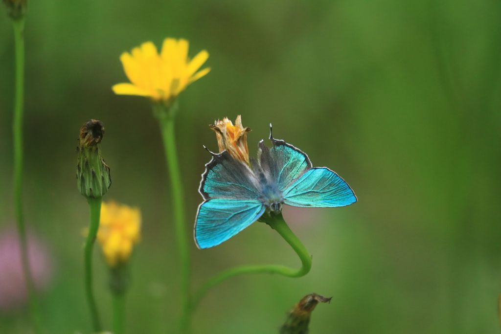 チョウ目シジミチョウ科のうち「ゼフィルス」と呼ばれる一群、主に青緑色に輝く翅を持った蝶が今年も旭山で見られるようになりました。