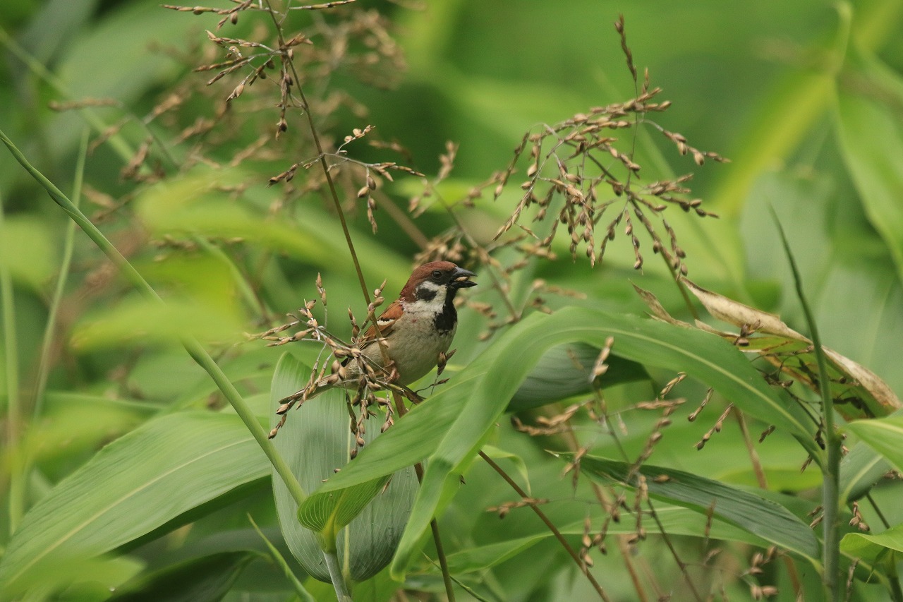 今年はクマイザサにたくさんの花が咲き、実も豊作、スズメはやっぱりイネ科の植物が好きなのでしょう。