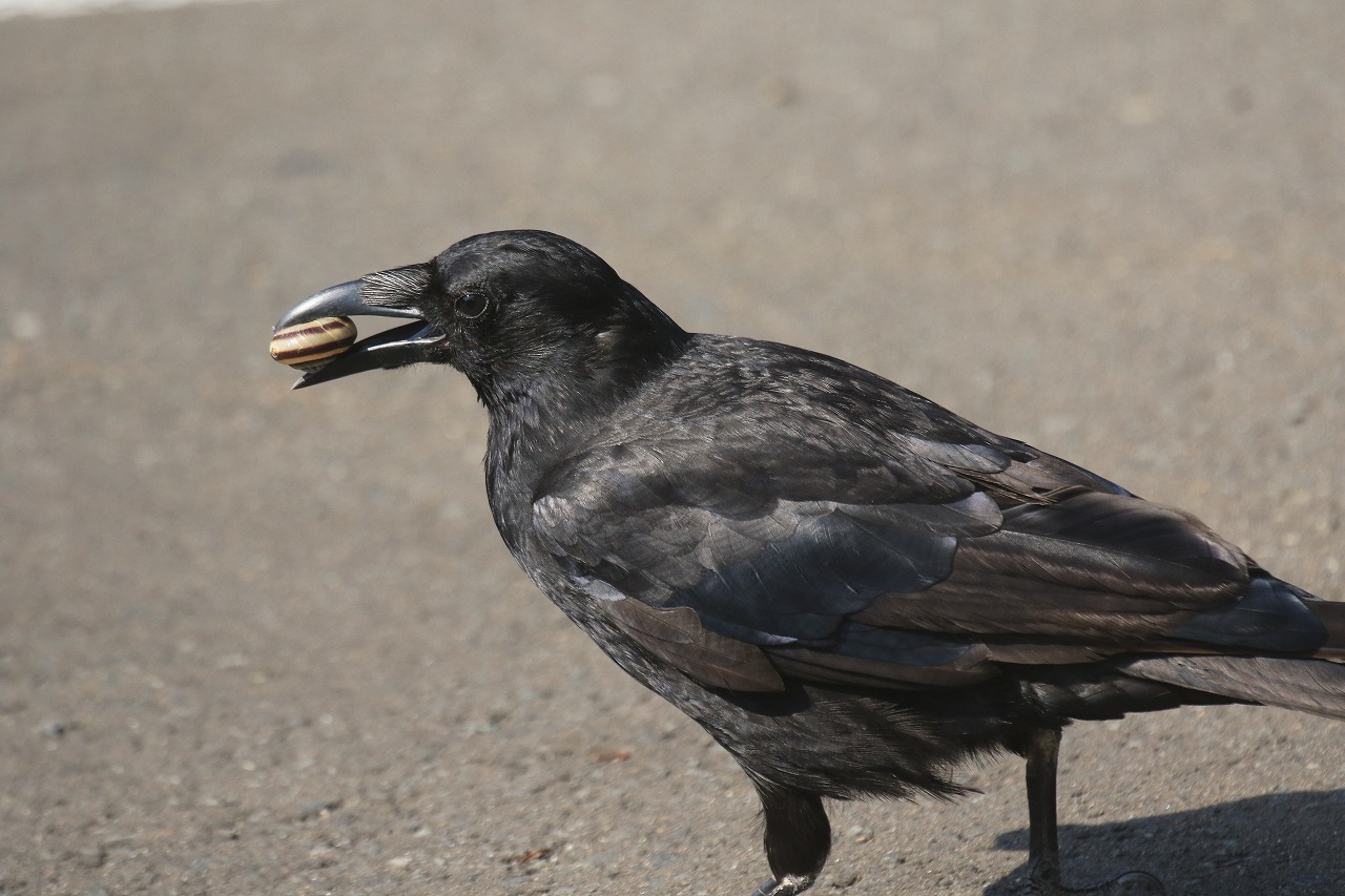 写真は上がサッポロマイマイをくわえたハシボソガラス、下がハシブトガラスです。