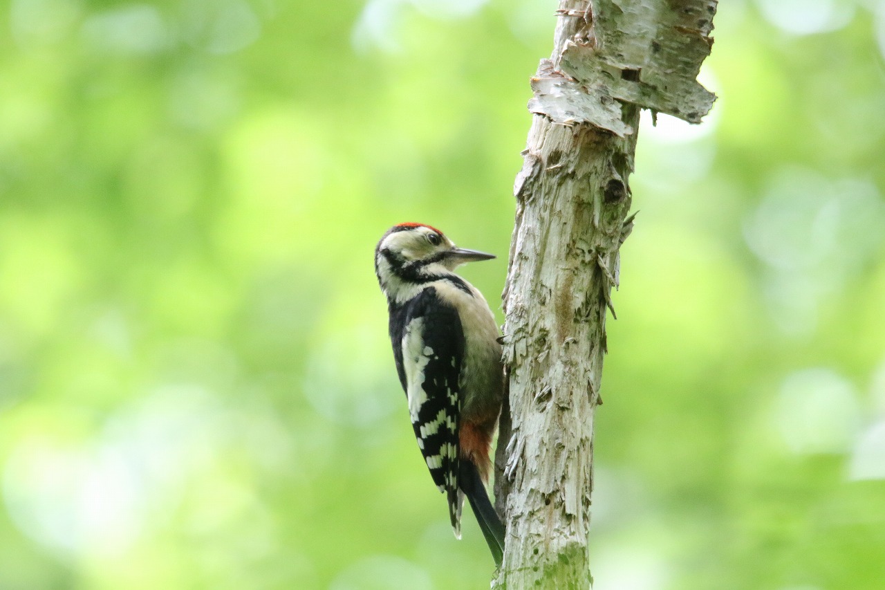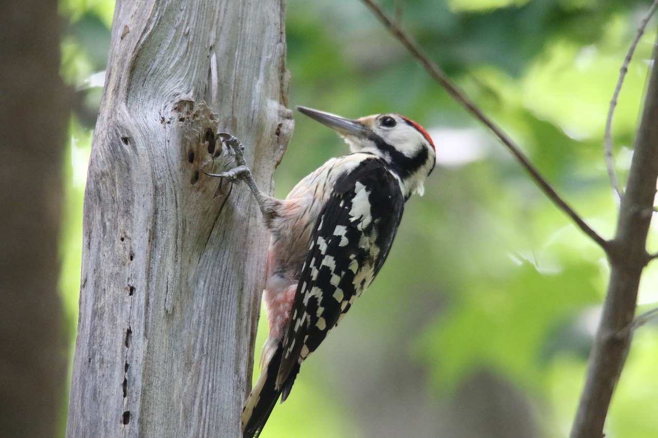 今週も幼鳥が園内で観察されており(写真)、成鳥の観察情報もまた増えてきましたが、アカゲラは近くに人がいない場合は鳴き声を出さないことが多く、双眼鏡で森の中を見るといた、ということがよくあります。