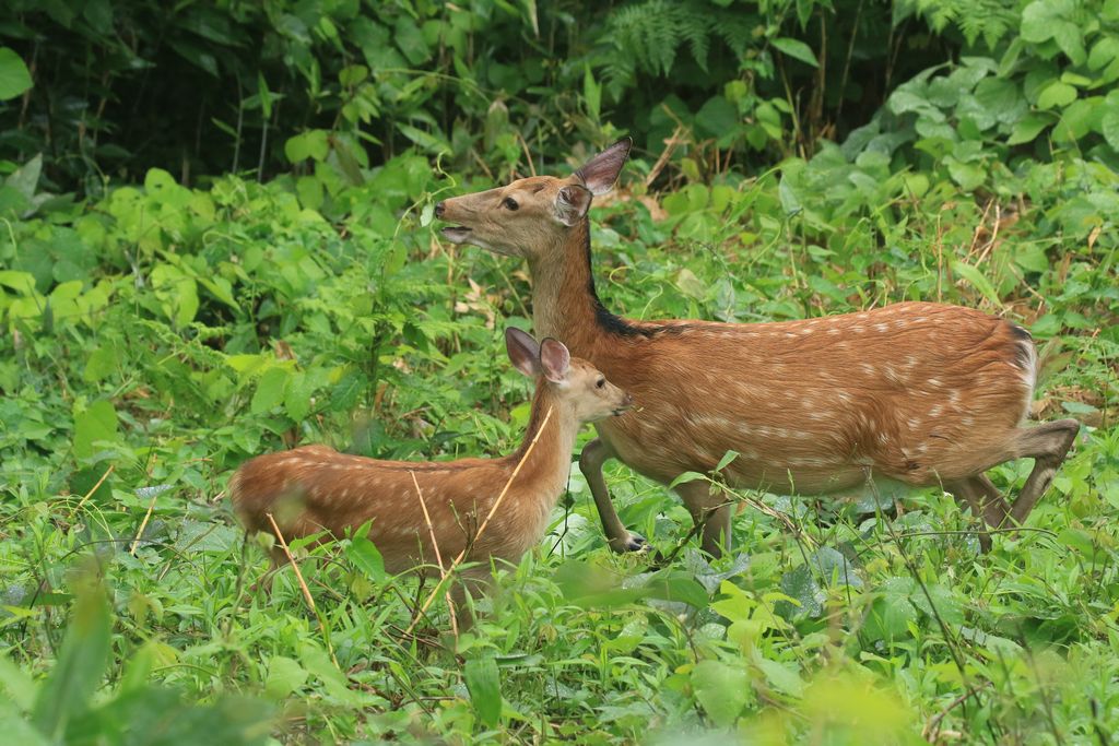 7月23日土曜日、まだ雨で人出が少ない朝、ちびっこ広場に母と子のエゾシカ親子が現れました。