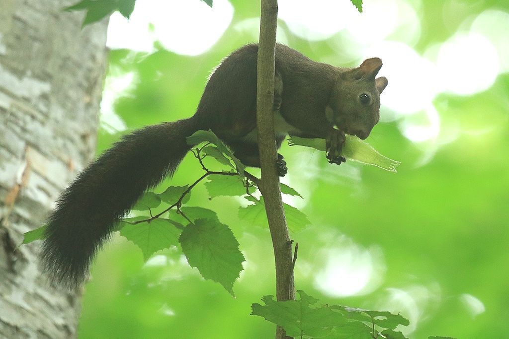 エゾリスがヘーゼルナッツ=ツノハシバミの実を食べていました。