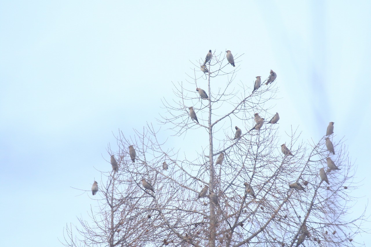 キレンジャクは50羽ほどの群れで飛んでいることもありますが、ヒレンジャクは今のところそれほど数は多くはなく10羽以下の群れで見られています(例年通りではありますが)。