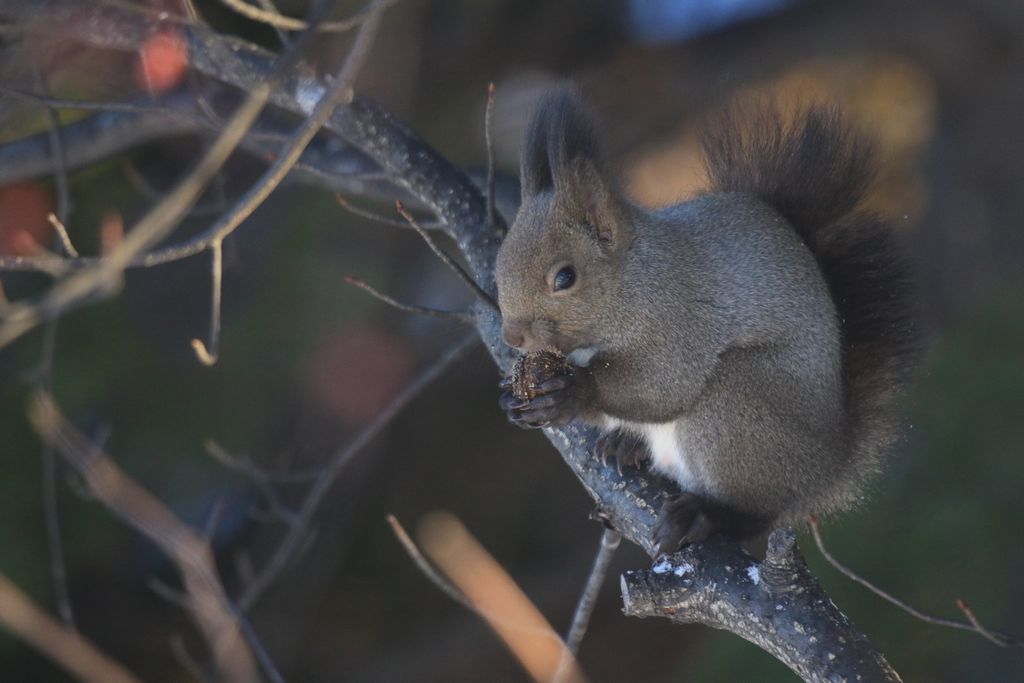 くるみ(オニグルミの実)を食べるエゾリスの動画が撮れました。 映像は50秒弱、食べ終えて上の枝にジャンプし消えたところで終わります。
