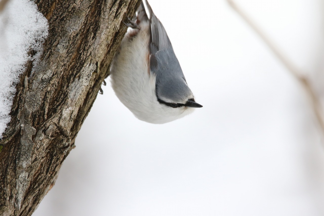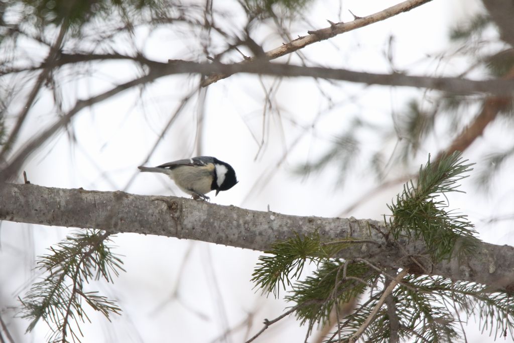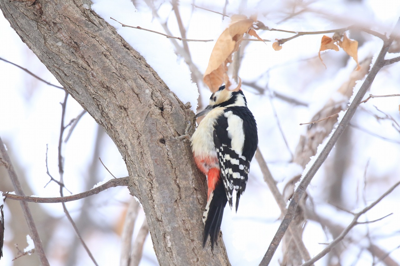 写真はカラマツに寄って来た時のものですが、この時はカラマツにいる虫ではなく種子そのものを食べていたようで、木の下の雪面にカラマツの種子の食べかす(殻)がたくさん落ちていました。