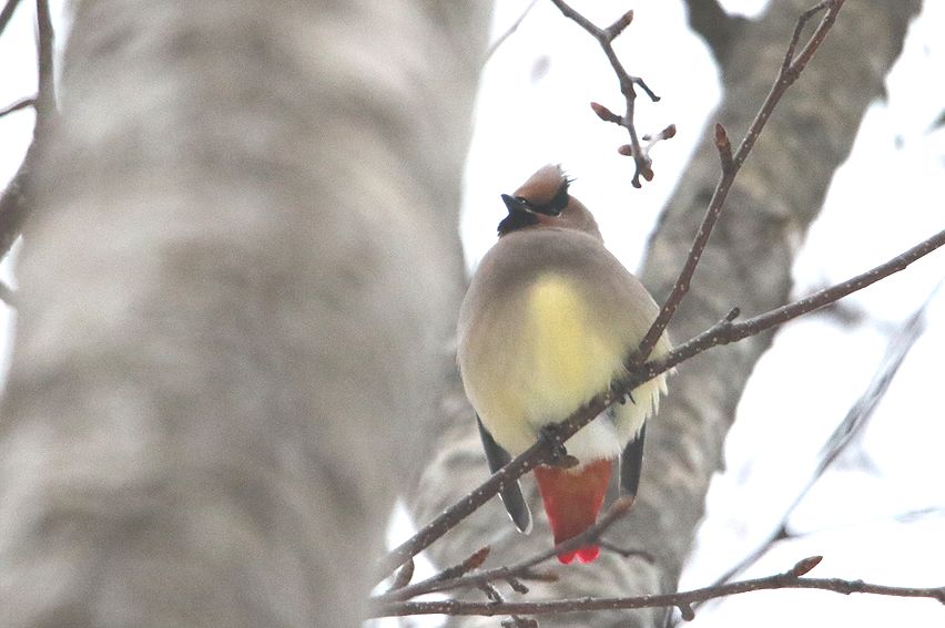 今日は飛んでいる15羽前後の群れをやや遠くに見ましたが、キレンジャクの鳴き声が聞こえ、一方ヒレンジャクの声は聞こえなかったので、それはキレンジャクだけの群れだった可能性があります(ヒレンジャクの群れも別の機会に目視確認しています)。