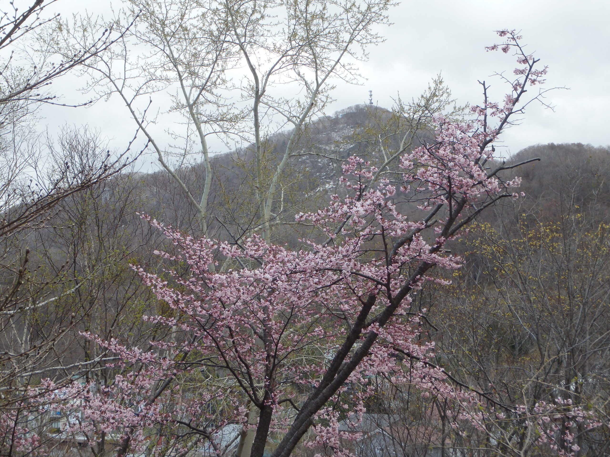 森の家の前の広場から望む、桜と藻岩山。