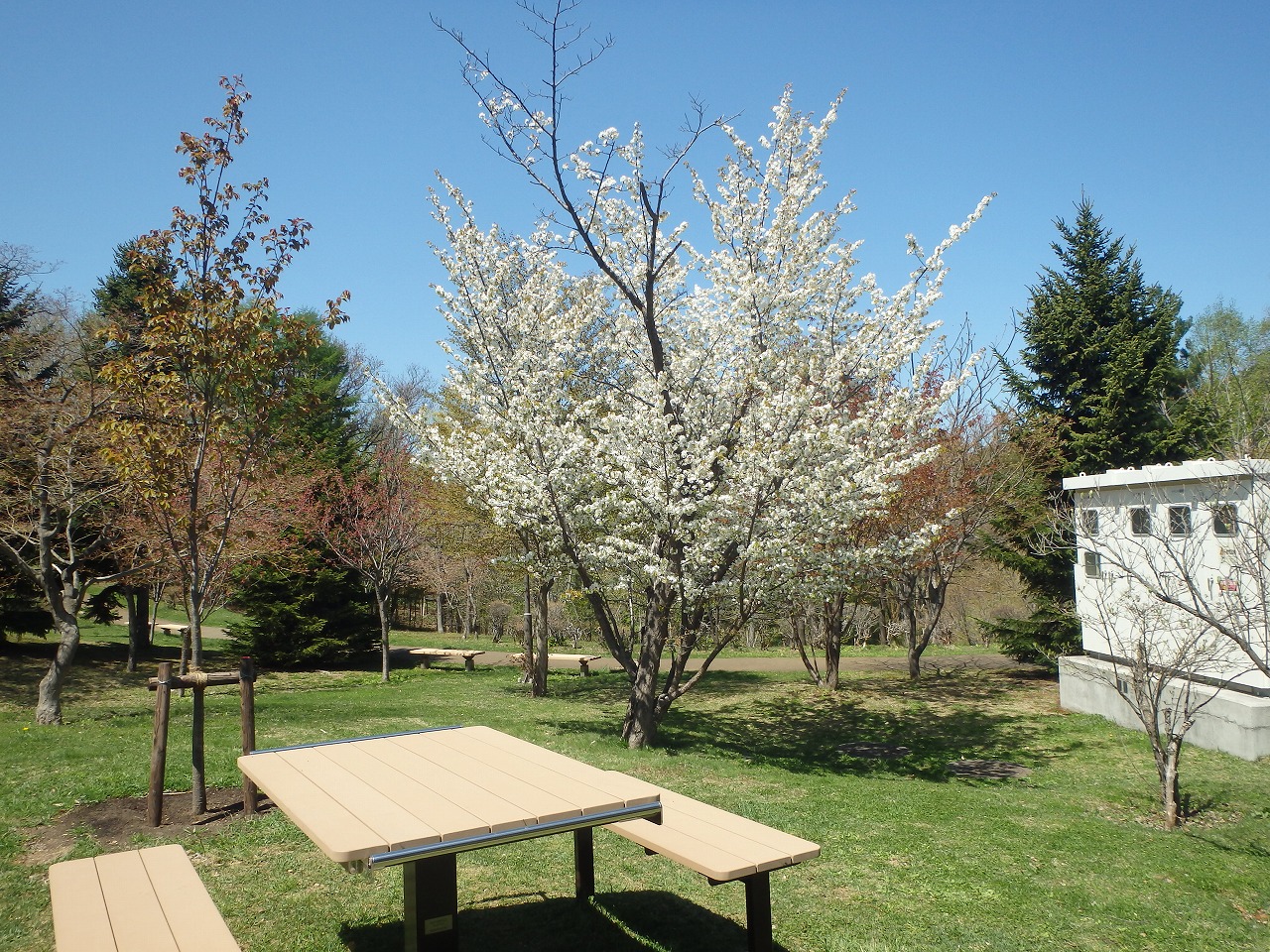 一番東側、新しいテーブルベンチセット近くにあるカスミザクラは見ごろです。