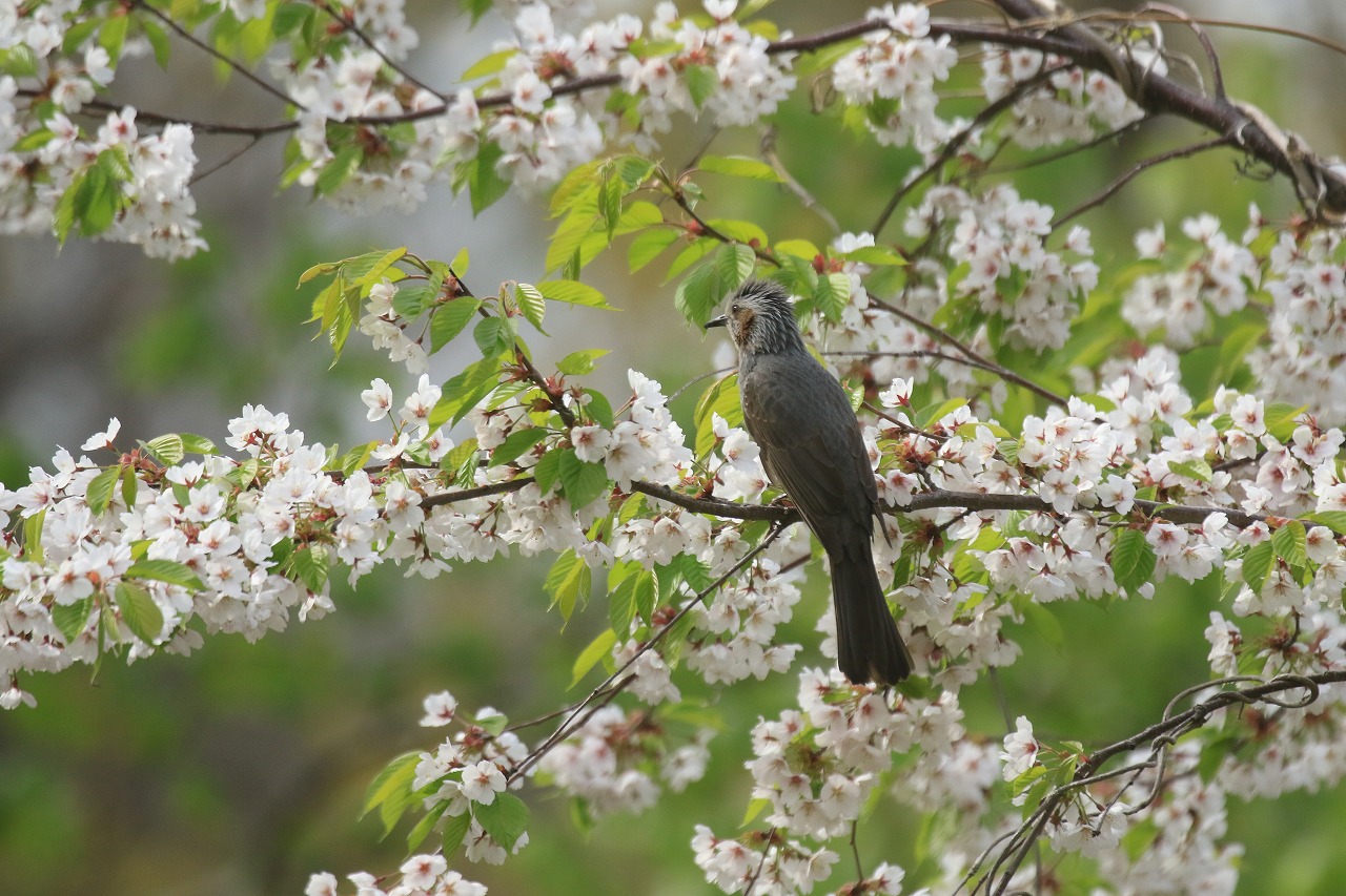 写真はカスミザクラに来たヒヨドリで、カスミザクラの白い花は今園内何か所かで見られています。