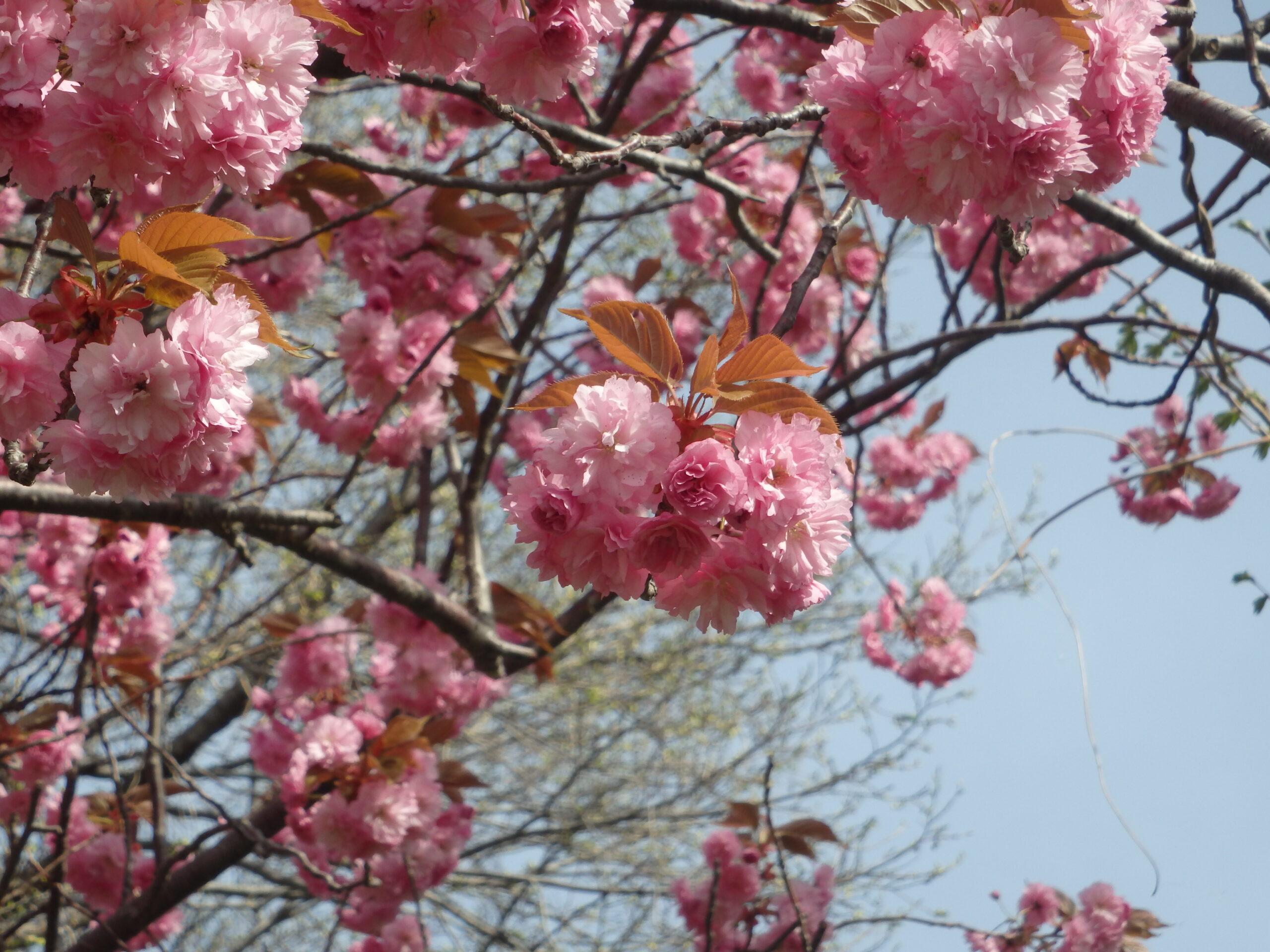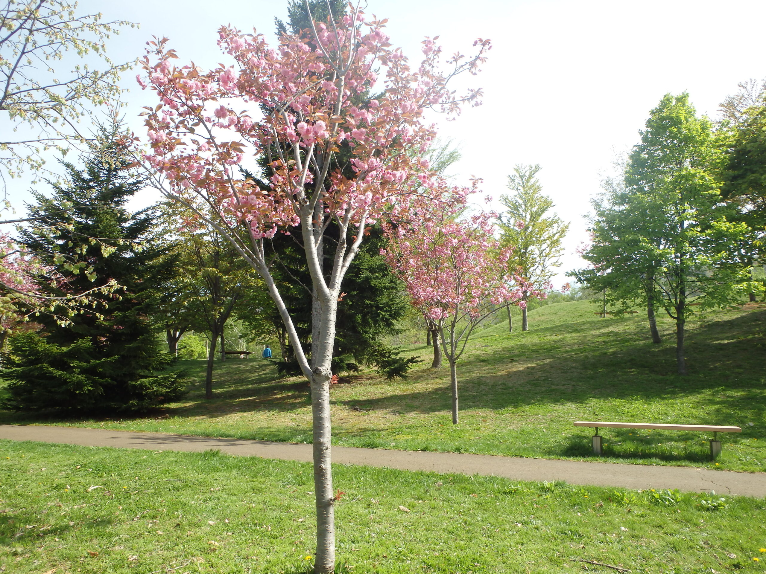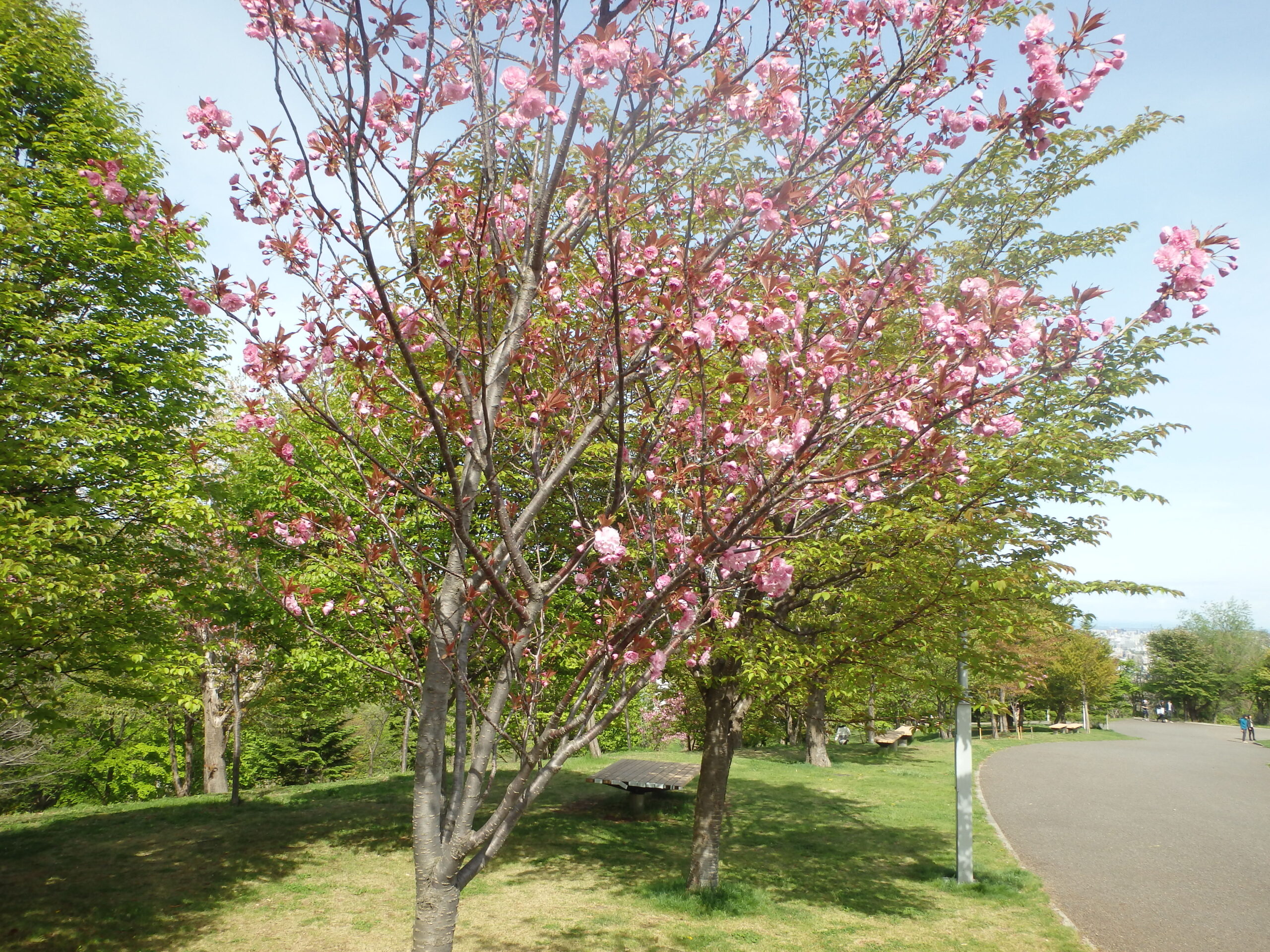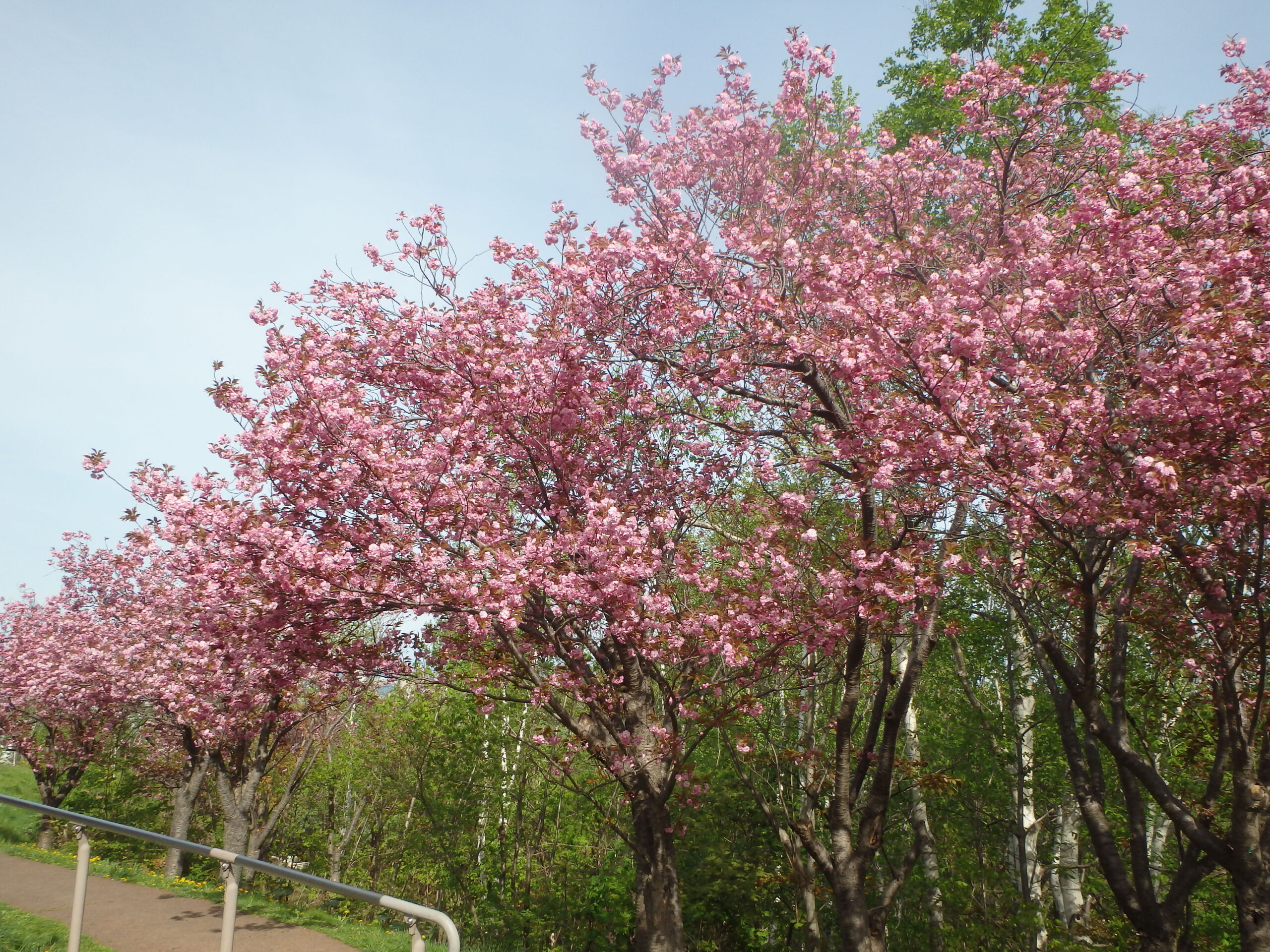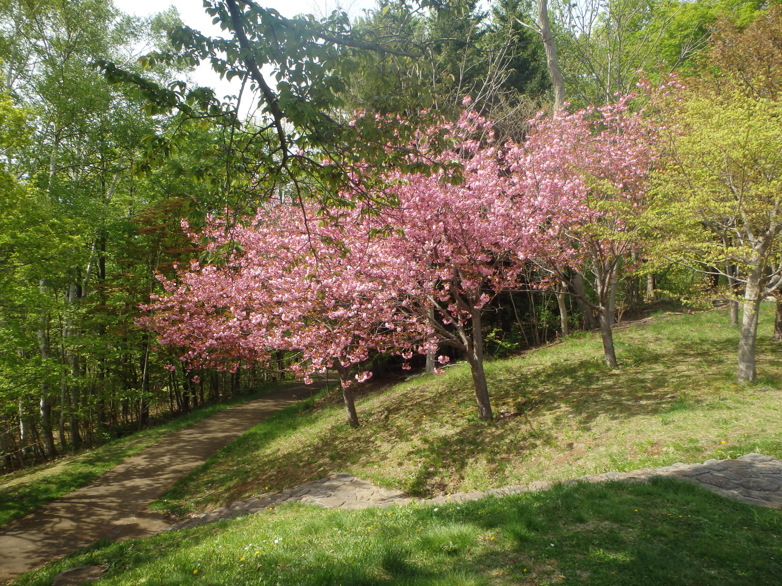 新桜並木から、北側の散策路にも八重桜が咲いています。